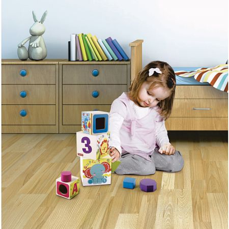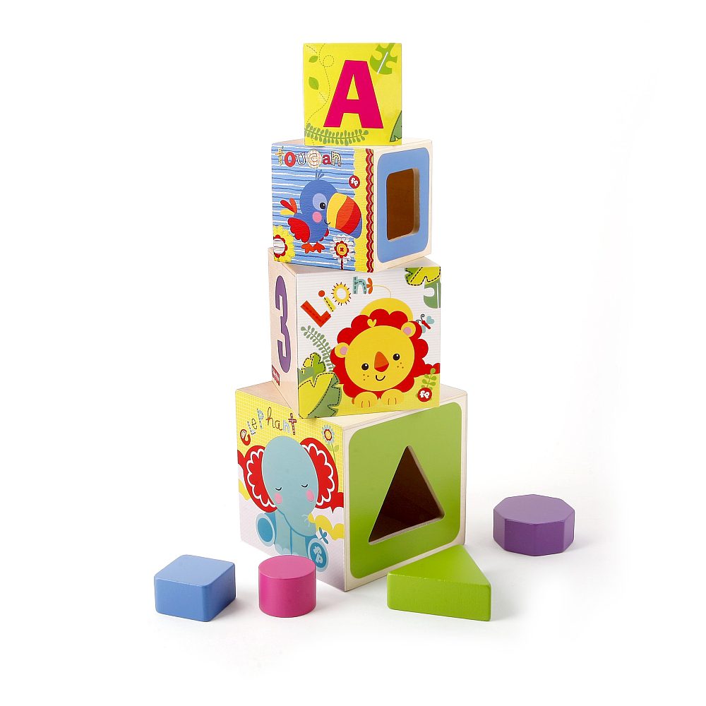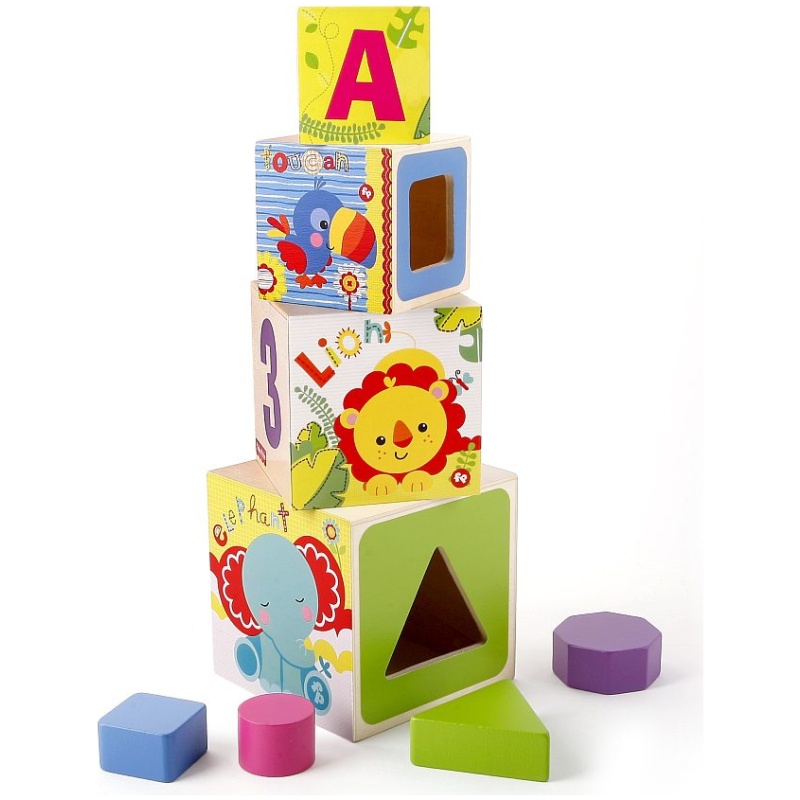 Ove kvalitetne drvene kocke su od proizvođača Fisher Price. Veselih su šarenih boja. Na njima se nalaze slova, brojevi, životinje i udubljenja. U udubljenja se mogu stavljati odgovarajući oblici kao što su trokut, kocka, krug i oktagon. Dodatni oblici su različitih boja kako bi dijete učilo i boje. Igračka je edukativna i zabavna te će dijete s lakoćom svladati igru i naučiti brojeve, slova, boje i oblike. Namjenjena je za bebe od 12 mjeseci.