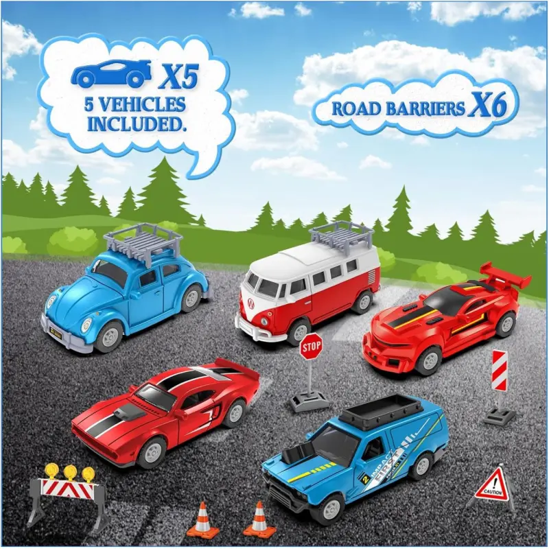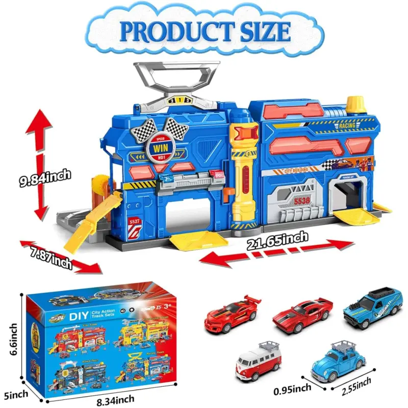Paket uključuje: 1x garaža, 5x tematskih vozila, 1x uputstvo, 1x set naljepnica koji odgovara temi, 1 paket zaštitnih ogradica za cestu, 3x LR44 baterije su već uključene (već su instalirane u proizvodu).