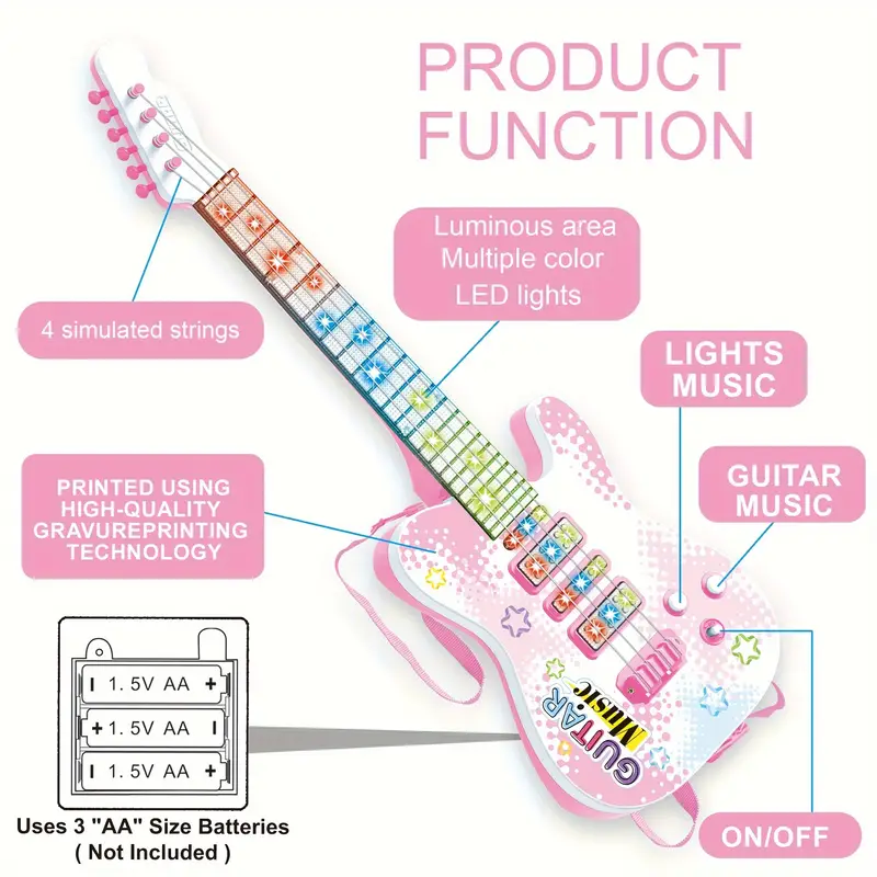 5 glazbenih pjesama koje potiču glazbenu znatiželju i sluh. LED svjetla koja svijetle u ritmu sviranja – vizualna stimulacija koja oduševljava. Infracrveni senzor koji detektira pokrete prstiju i reagira na “trzanje žica”, stvarajući osjećaj stvarnog sviranja. ABS materijal – izdržljiv i siguran za malu djecu. Ergonomski dizajn i podesivi remen – lako nošenje i sviranje u pokretu.
