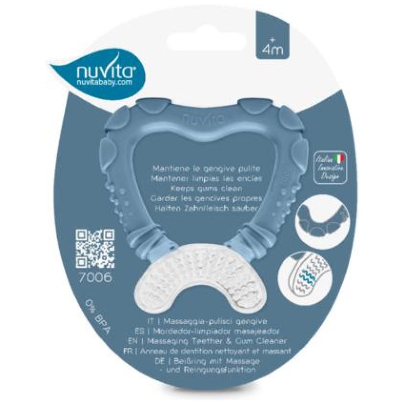 Praktična kvalitetna glodalica za bebu od Nuvite. Namijenjeno je za bebu od 4+ mjeseci. Korisna u izrastanju zubića, ublažava bol, svrbež i nadraženost. Zbog svog oblika praktična je za masažu desni i zubnog mesa. Idealan proizvod za svaku bebu.