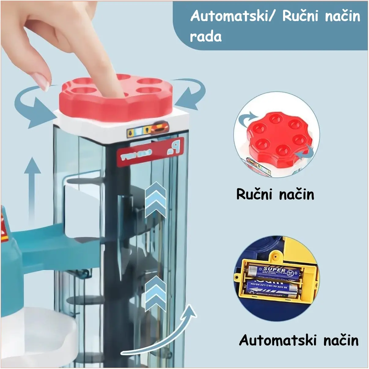 Ova visokokvalitetna igračka izrađena je od izdržljive i sigurne ABS plastike za malu djecu. Ne samo da pruža zabavu, već također potiče razvoj kognitivnih i motoričkih vještina. Djeca će moći vježbati pokrete ruku kontrolirajući radnje garaže ručno ili jednostavno će gravitacija odvesti minijaturne automobile unutar i izvan parkirališta.