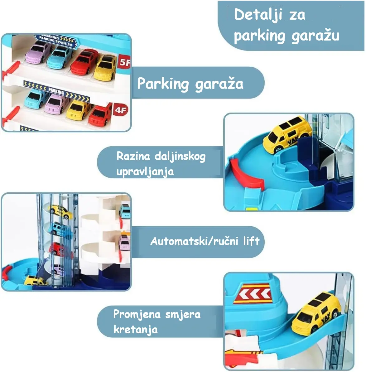 - Zabavna i dinamična igra s petospratnom garažom za automobile.