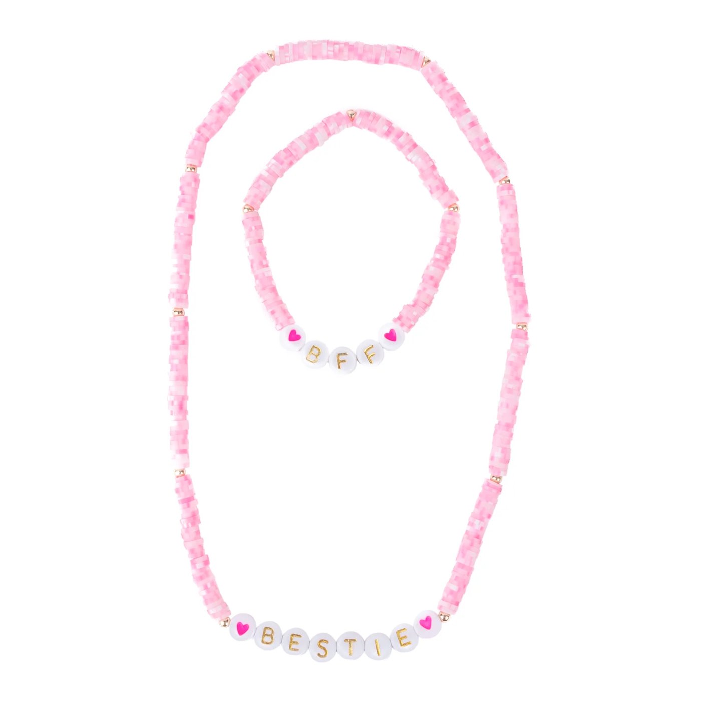 Narukvica nosi natpis “BFF” s dva prekrasna ružičasta srca, dok ogrlica ponosno prikazuje riječ “BESTIE” uokvirenu istim srdačnim motivima. Ovaj set nije samo modni dodatak, već i podsjetnik na važnost prijateljstva, savršen za dijeljenje s najboljom prijateljicom ili kao osobni suvenir koji će uvijek izmamiti osmijeh.