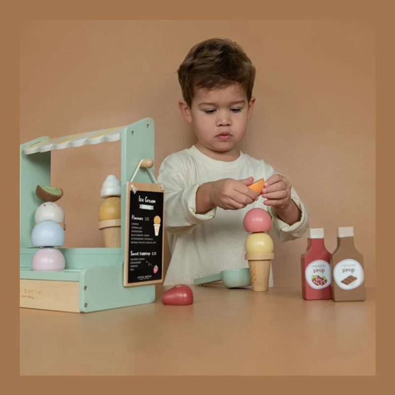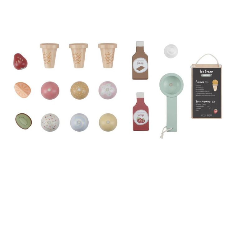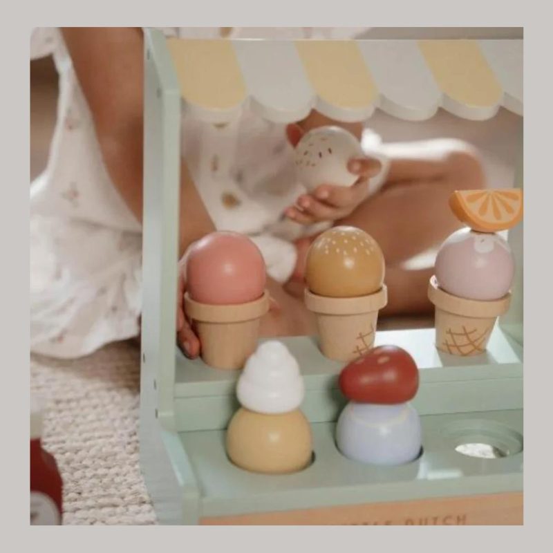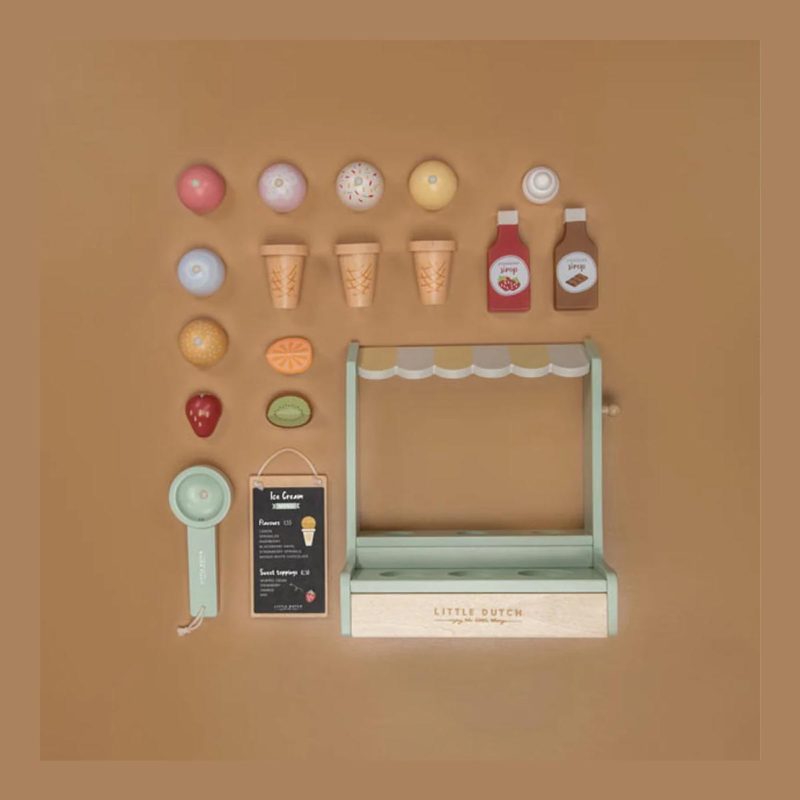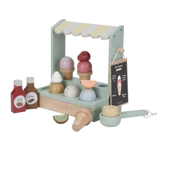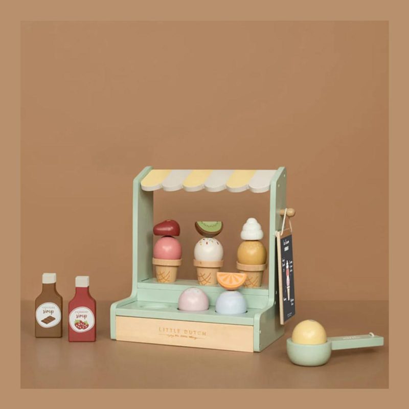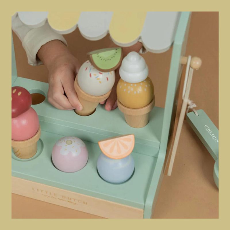 Predstavljamo ti malu holandsku slastičarnicu brenda Little Dutch, izrađenu od kvalitetnog drva. Namijenjena je djeci starijoj od 3 godine. U paketu dolaze slastičarnica s 3 sladoleda, raznih okusa i slatkim preljevima.