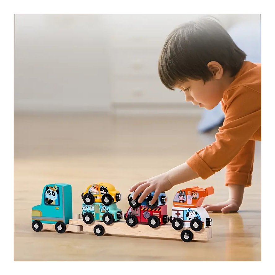 Zamislite radost na licu vašeg djeteta dok upravlja šarenim kamionom tegljačem i šest jedinstvenih vozila s različitim temama. Svako vozilo dolazi s magnetnim spojevima, što omogućava lako spajanje i odvajanje, potičući razvoj fine motorike i koordinacije ruku i očiju. Neka vaše dijete uživa u igri s hitnom pomoći, policijom i drugim zanimljivim vozilima, a sve to uz veseli dizajn koji uključuje živopisne ilustracije simpatičnih životinja.