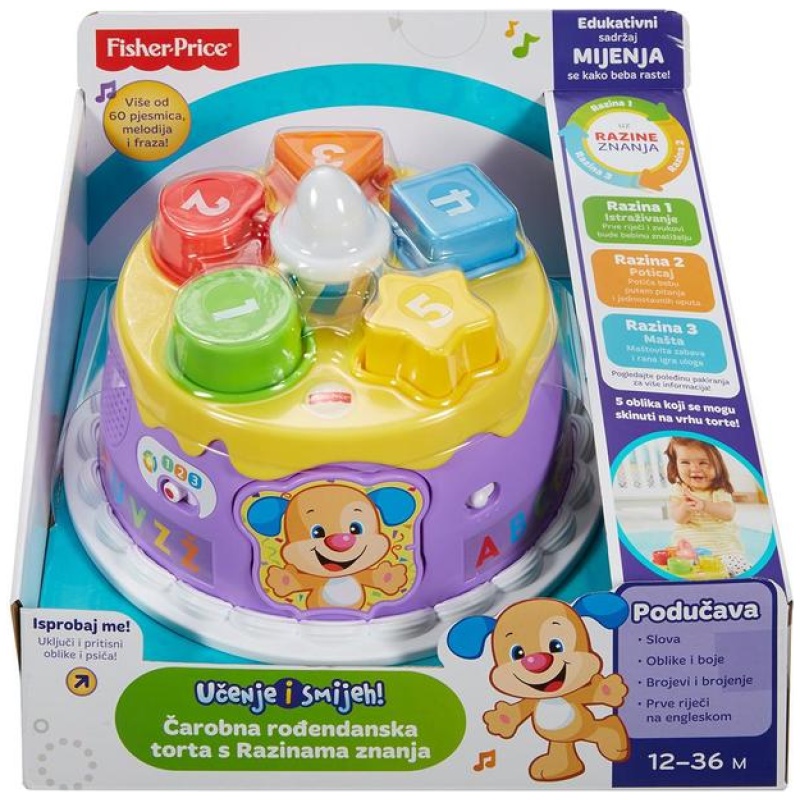 Kvalitetna Fisher Price igračka za djecu. Zaželi želju! Psić i ova šarena rođendanska torta donose zabavnu igru sa slaganjem oblika, veselim zvukovima, glazbom, magičnim svjetlima i još mnogo toga.
