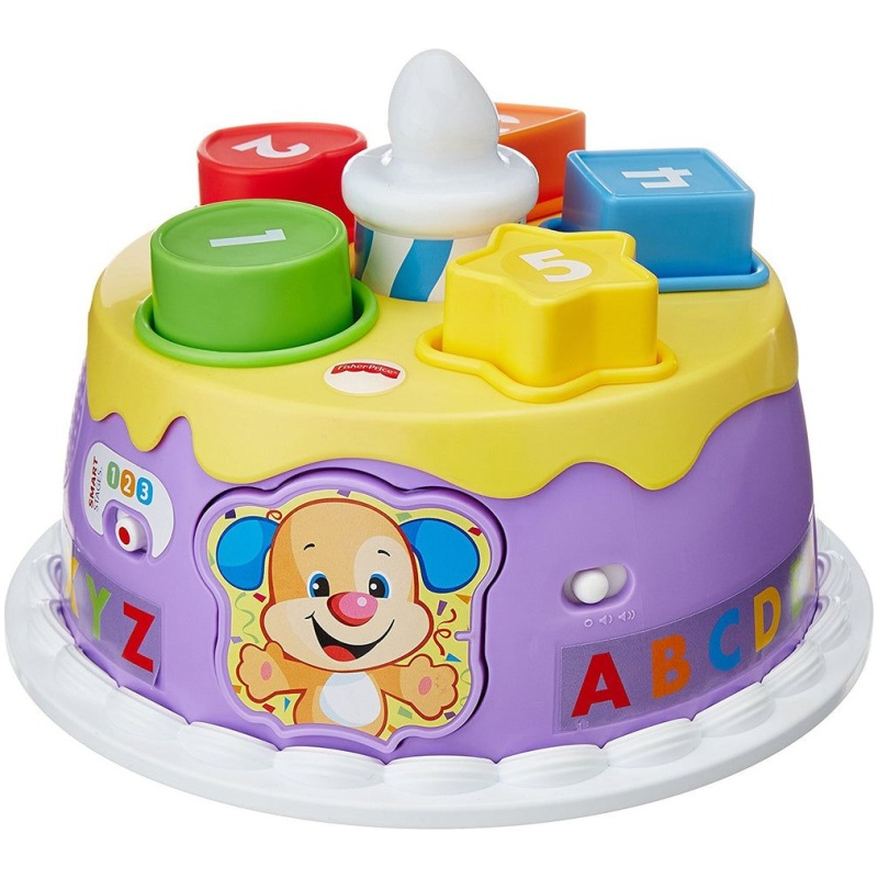 5 oblika u različitim bojama, obilježeni brojevima od 1 do 5 dekoriraju ovu zabavnu tortu! Spremni za puhanje svjećica? Svjećica se pali u više boja koje se mijenjaju prema oblicima koje dijete ubacuje u oblike obilježene brojevima na torti! Male ručice mogu pritisnuti dugme sa slikom Psića i čuti fraze, najnoviju rođendansku pjesmicu i naučiti oblike, boje i prve riječi na engleskom.