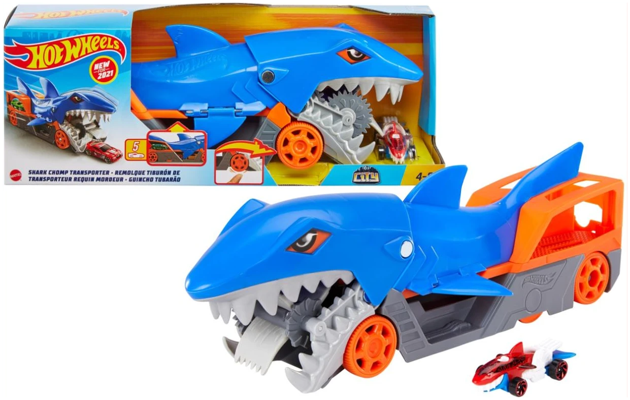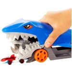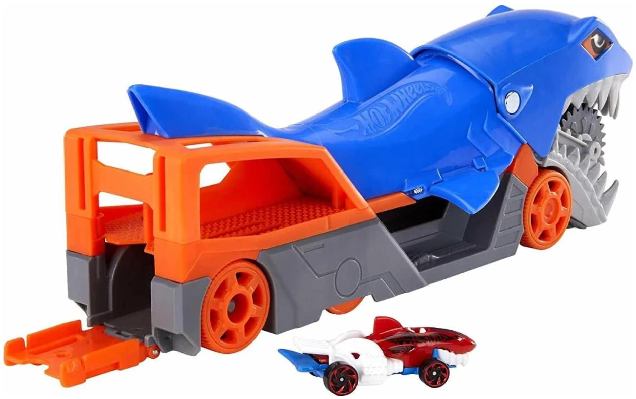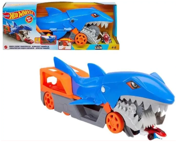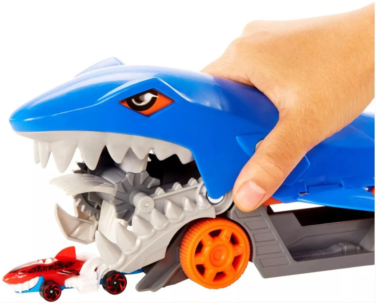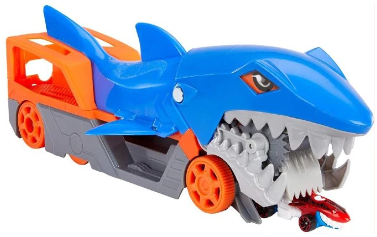 Zahvaljujući posebnom mehanizmu koji se aktivira dok djeca guraju ovo vozilo, morski pas hvata autiće svojim raljama i sprema ih u trbuhu. Moraš ga iskrcati? Sa stražnje strane nalazi se rampa za jednostavan pristup autićima skrivenim u trbuhu morskog psa. Hot Wheels transporter morski pas dolazi u setu s jednim Hot Wheels autićem tako da igra može odmah započeti. U trbuh morskog pas mogu stati do četiri autića. Djeca će obožavati na ovaj način pospremati svoje autiće.