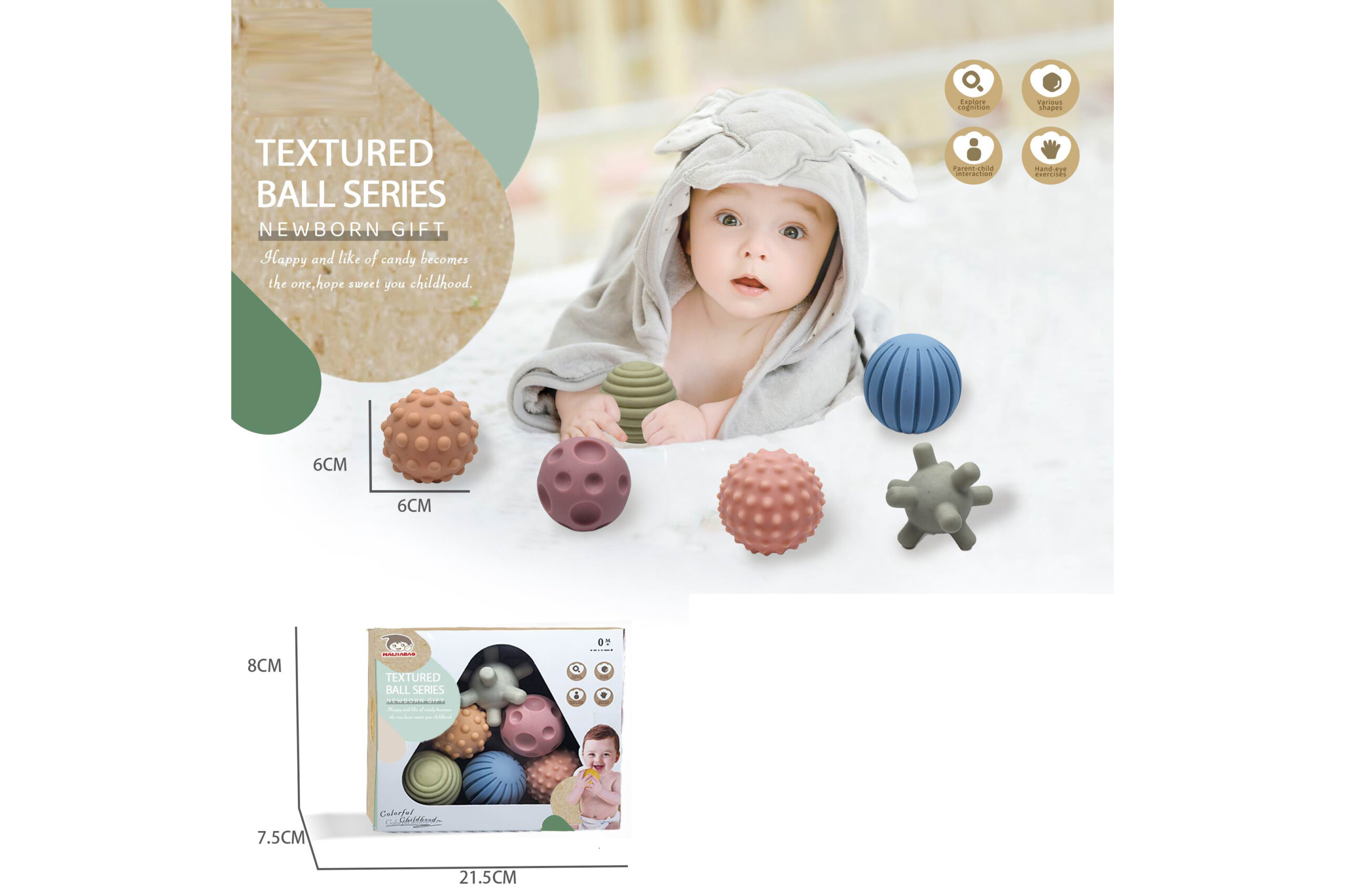Svaka loptica izrađena je od mekane gume, što ih čini iznimno stiskavima i sigurnima za male ruke. Njihova jedinstvena tekstura pruža različite taktilne doživljaje, pomažući u razvoju motoričkih vještina i koordinacije ruku i očiju. Osim toga, svaka loptica ima promjer od približno 6 cm, savršene veličine za bebe da ih lako drže i istražuju.
