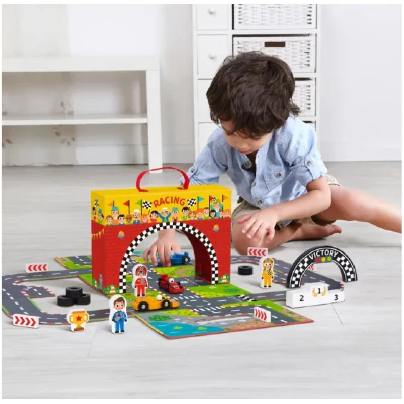 Kutija je kompaktna pa je možeš ponijeti sa sobom na putovanje ili kod prijatelja. Djeca mogu dizajnirati vlastitu trkaću stazu, natjecati se s prijateljima i osvajati nagrade. Sve se lako posprema u kutiju i može se ponijeti bilo gdje.