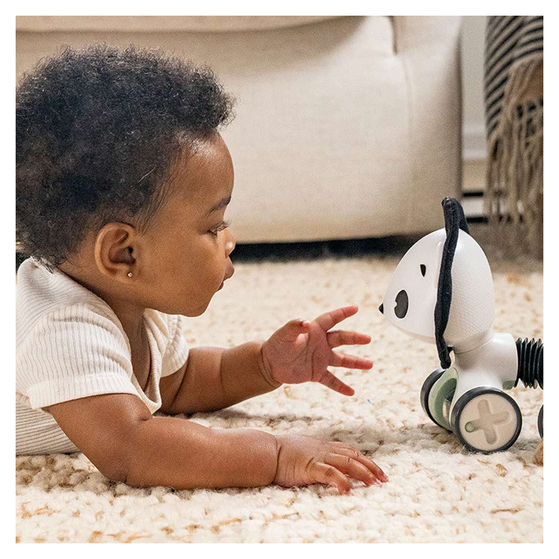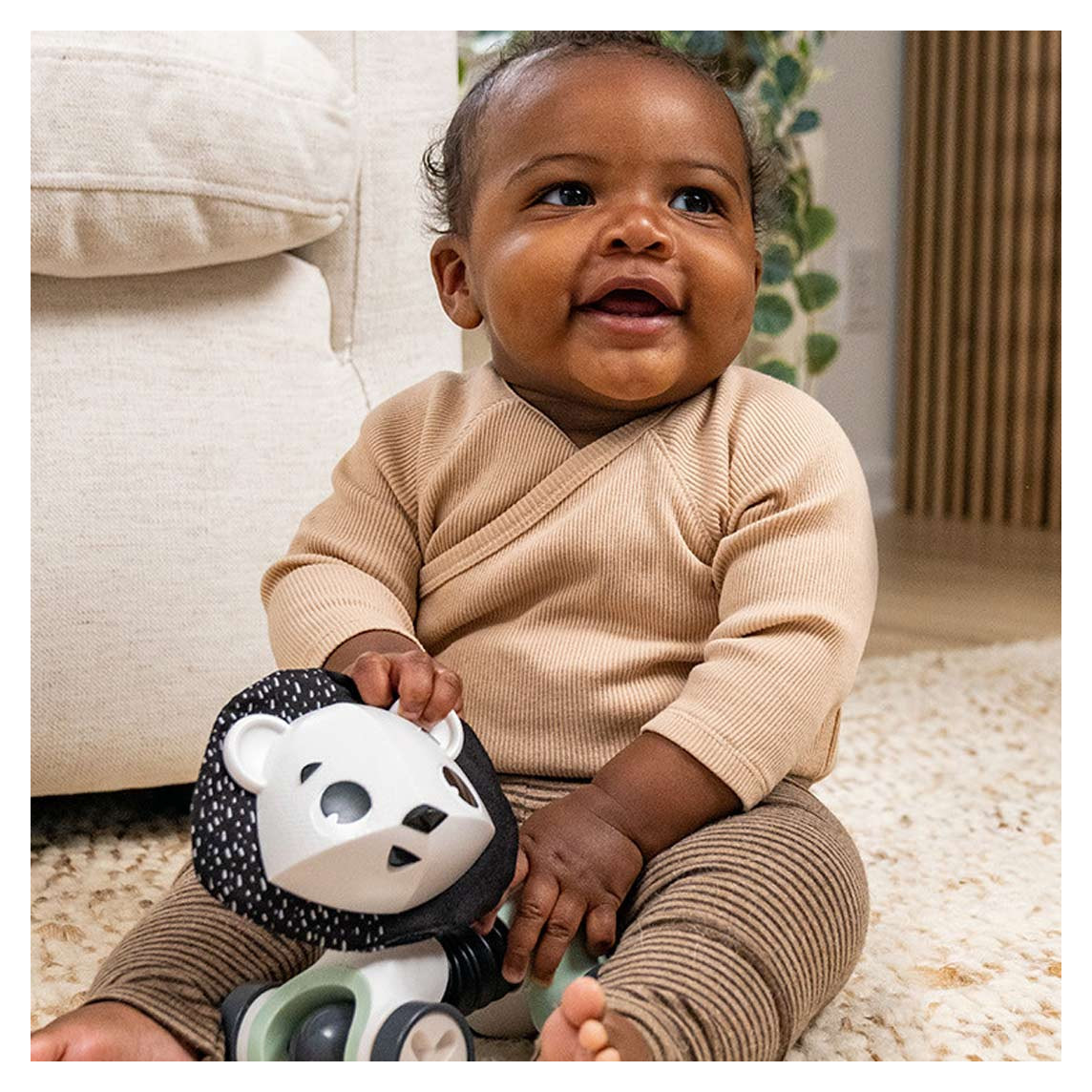 Kontrastni crno-bijeli uzorci posebno dobro odgovaraju ranom razvoju vida, dok šuškava tkanina, perlice i rotirajući dijelovi potiču dijete da posegne, gurne, uhvati i ponovi pokret. Takva igračka dobro se uklapa u tummy time, podnu igru i kasnije faze kada beba počinje sjediti i kretati se aktivnije.
