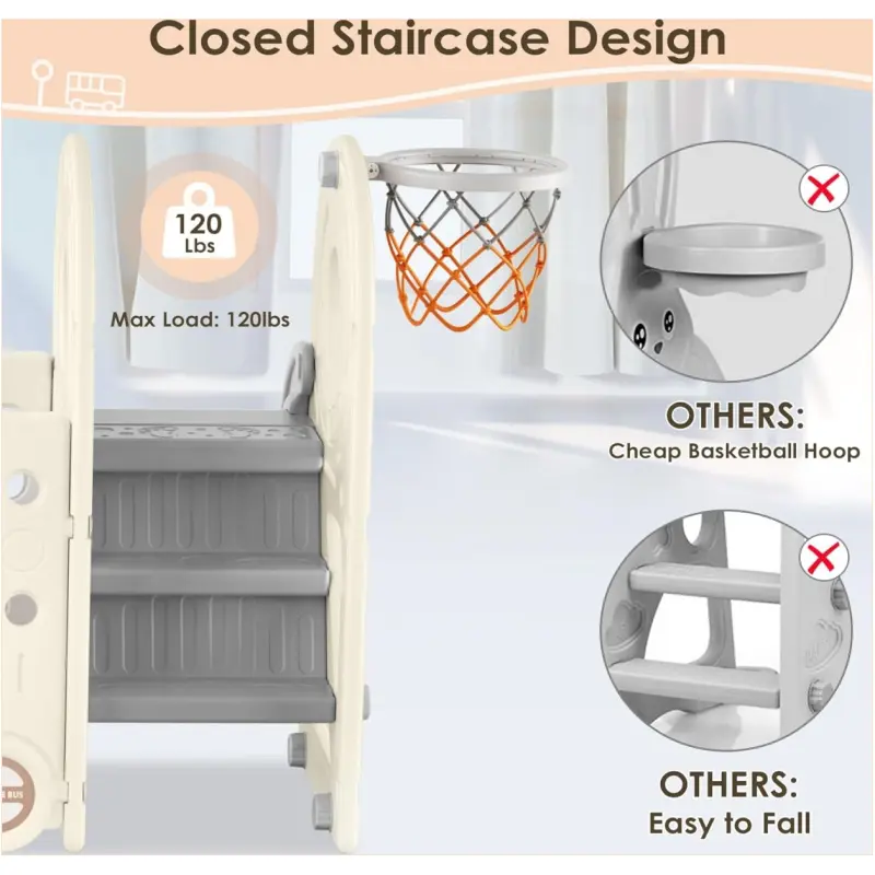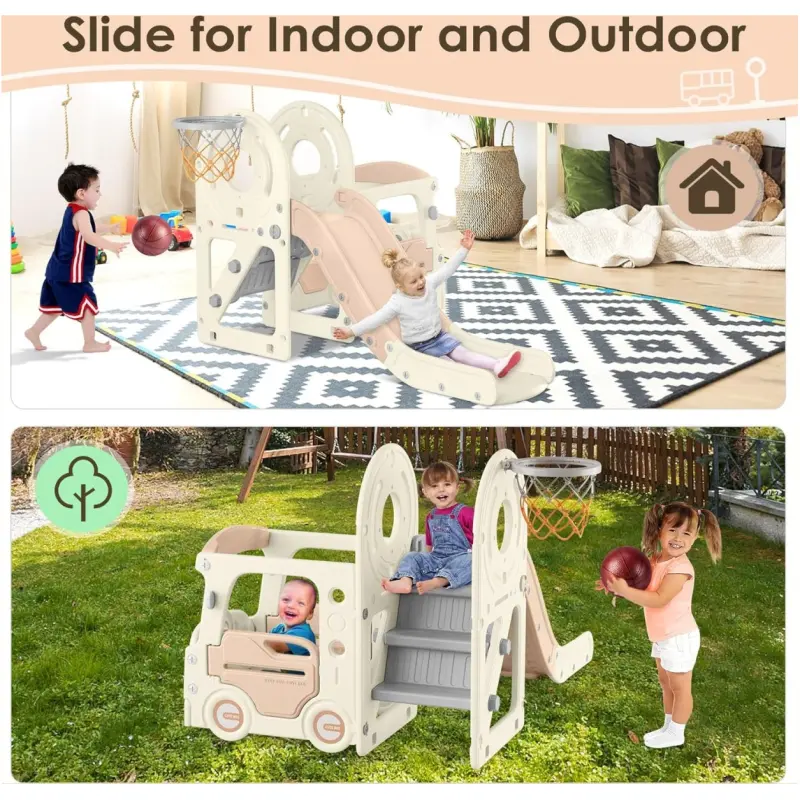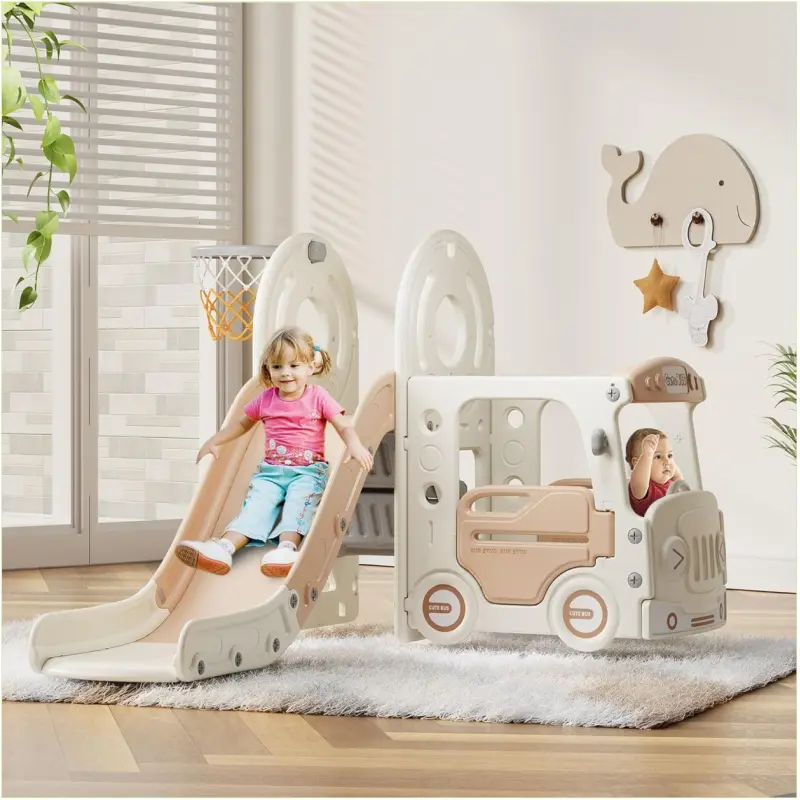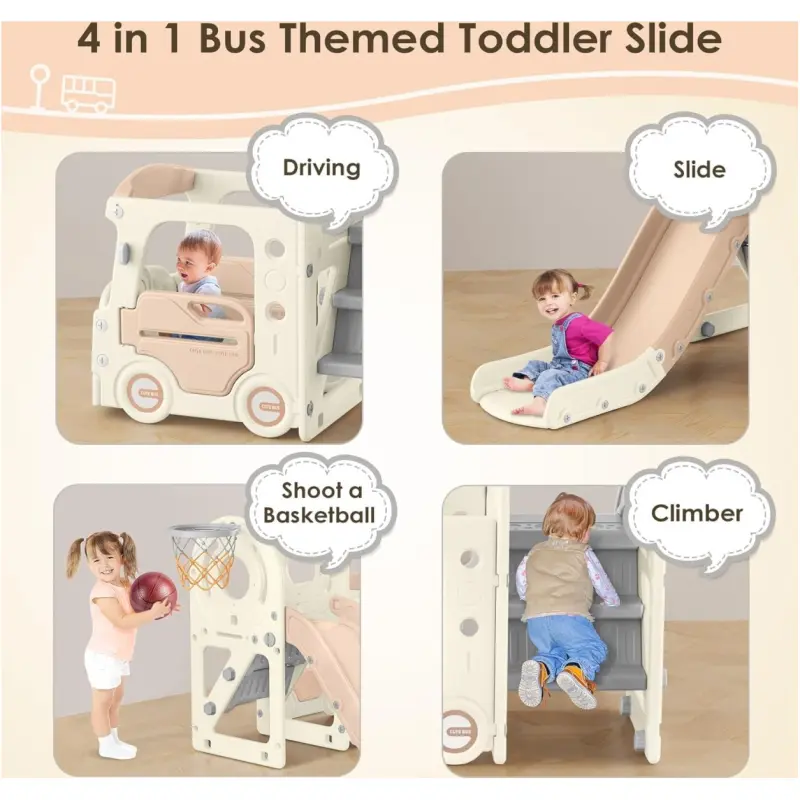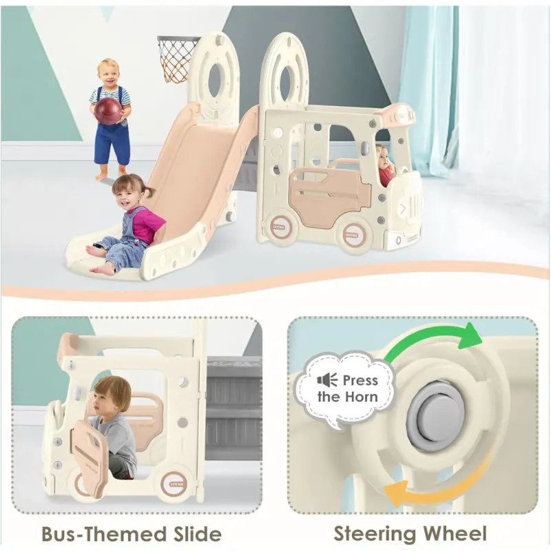 Ovaj set se sastoji od više funkcija koje omogućavaju djeci da se igraju na različite načine. Uključuje penjačku stijenu, tobogan, kućicu u obliku autobusa i funkciju bacanja košarke. Ove raznolike aktivnosti zadržat će djecu zainteresiranom i angažiranom te će im pružiti mogućnost istraživanja svoje mašte i kreativnosti.