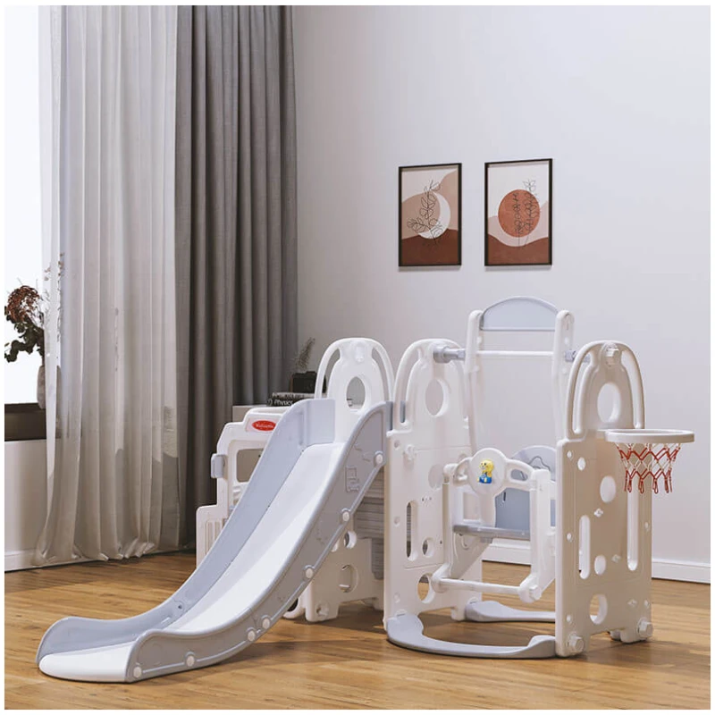 Set ljuljačke i tobogana 5 u 1 – Dječji tobogan je svestrano igralište za malu djecu, koje uključuje penjalicu, ljuljačku, tobogan, kućicu za igranje u autobusu i mogućnost igranja košarke, koja nudi razne aktivnosti kako bi djeca bila angažirana i kako bih se zabavljala. Kako bi se osigurala stabilnost i sigurnost tijekom korištenja, preporuča se dodavanje vode ili pijeska u bazu ljuljačke.