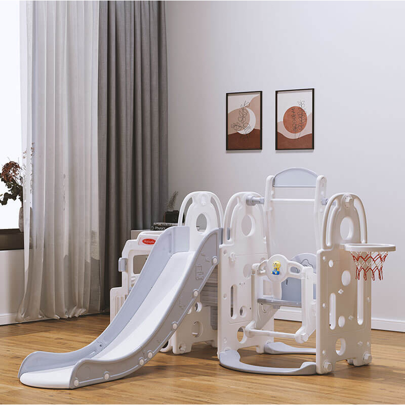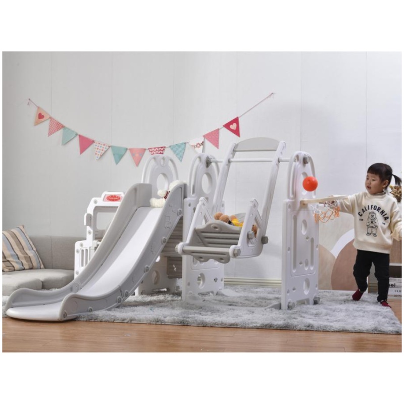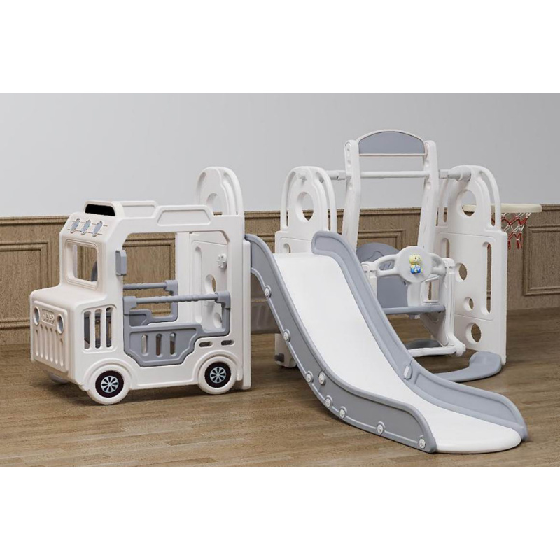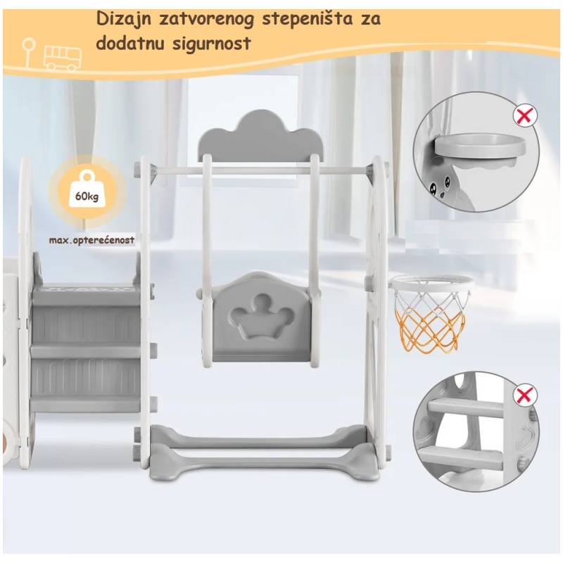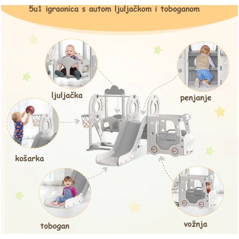 Set ljuljačke i tobogana 5 u 1 – Dječji tobogan je svestrano igralište za malu djecu, koje uključuje penjalicu, ljuljačku, tobogan, kućicu za igranje u autobusu i mogućnost igranja košarke, koja nudi razne aktivnosti kako bi djeca bila angažirana i kako bih se zabavljala. Kako bi se osigurala stabilnost i sigurnost tijekom korištenja, preporuča se dodavanje vode ili pijeska u bazu ljuljačke.