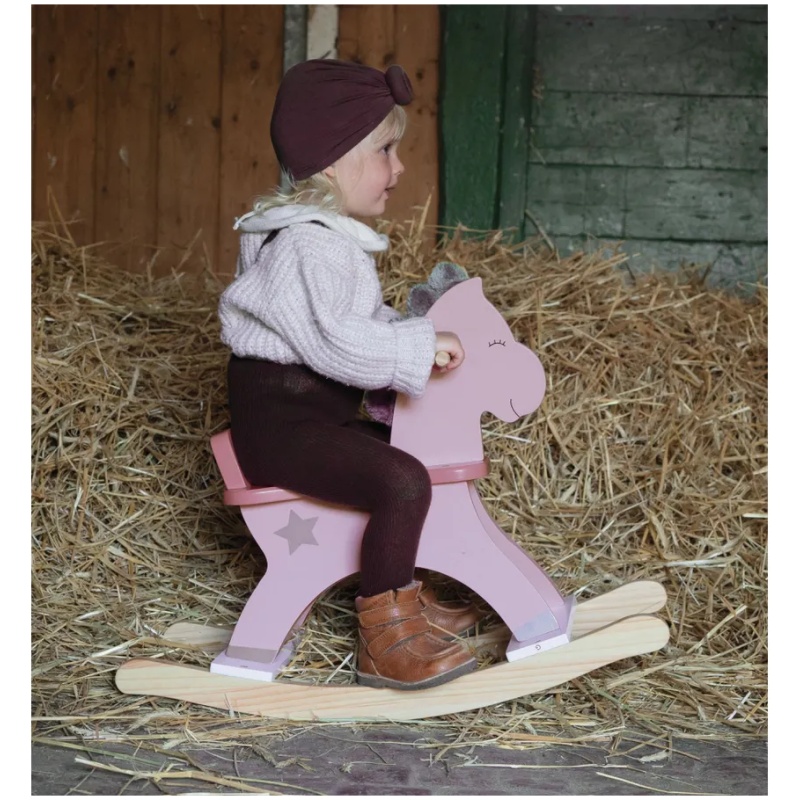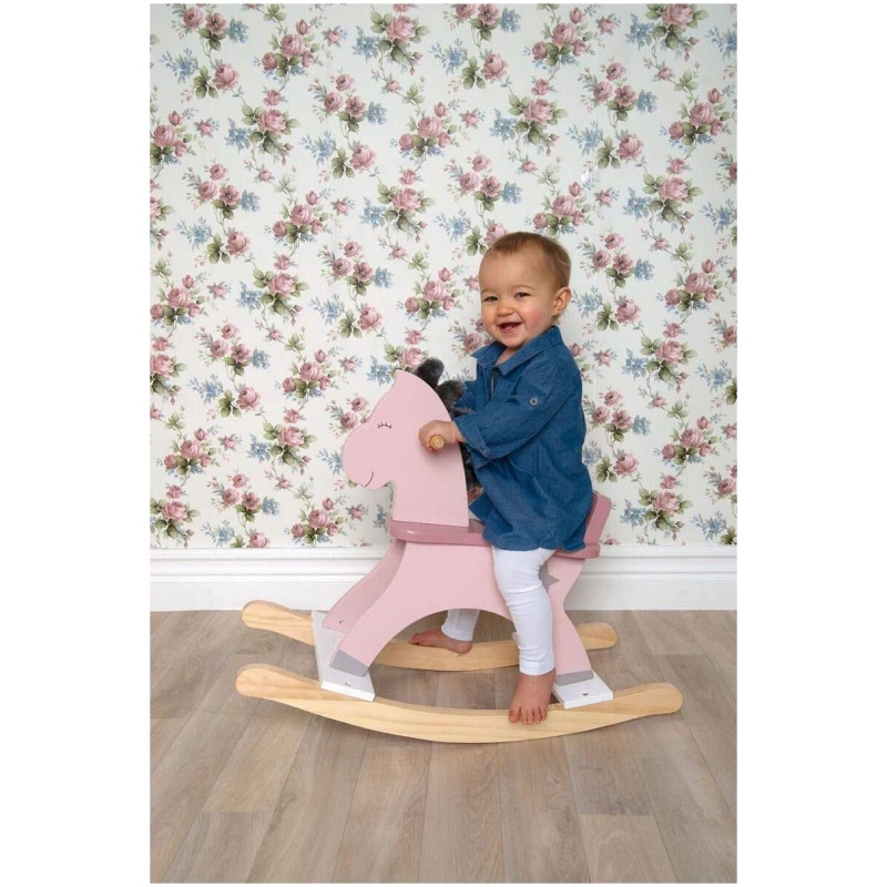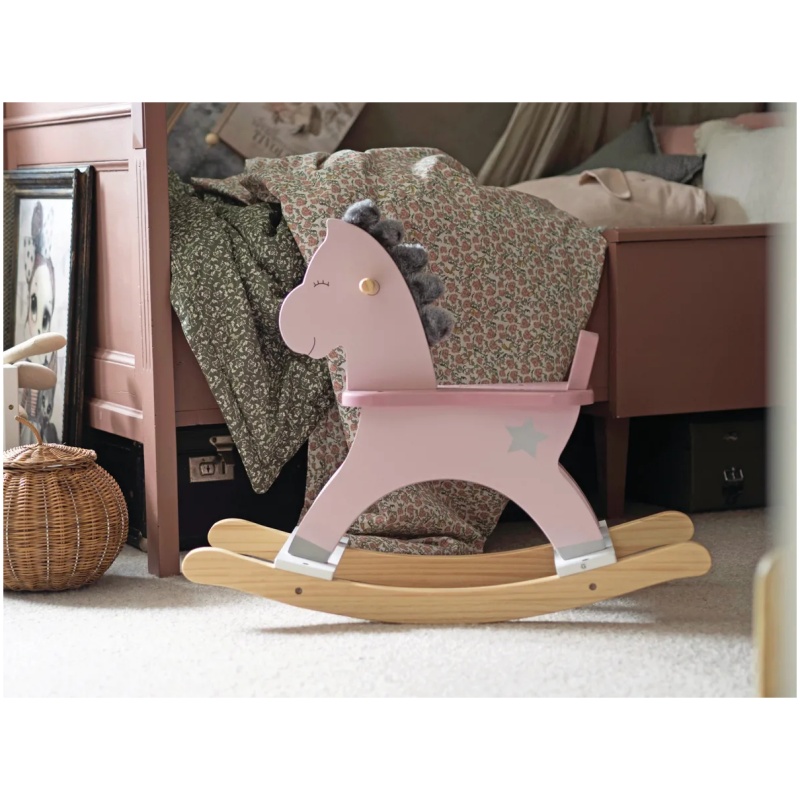 Ovo predivni konjić izrađen je od najkvalitetnijeg drva i ima dimenzije 70 x 28 x 55 centimetara. Izrađen je u raznim nijansama nježne ružičaste boje, posebno za djevojčice. Ima drvene noge od breze, a sam konjić ima predivnu grivu u tamno sivoj boji. Uz konjića dolaze i 2 drvena držača od boje breze, koji omogućuju maloj princezi da se pretvori u vještog jahača dok se njiše naprijed-natrag.