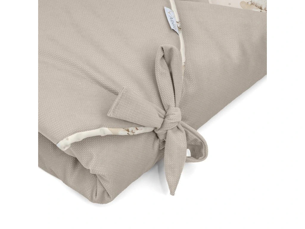 Proizveden u Poljskoj od visokokvalitetnih materijala, Albero Mio velvet swaddle nosi Oeko-Tex certifikat, jamčeći sigurnost i zdravlje čak i za najosjetljivije novorođenče. S unutrašnjom stranom od 100% pamučnog satena s ekološkim printom i vanjskom od mekanog poliesterskog baršuna, ovaj jastučić je primjer inovativne udobnosti. Iako tkanina može blago izblijedjeti uslijed učestalog pranja i izlaganja suncu, njezina sigurnost i funkcionalnost ostaju neupitne.