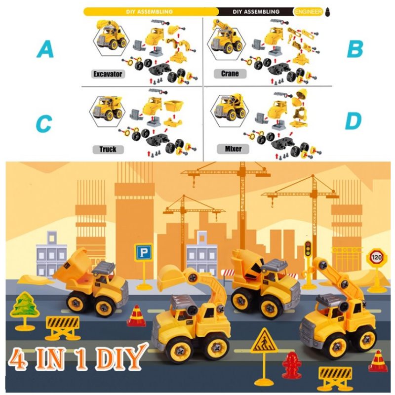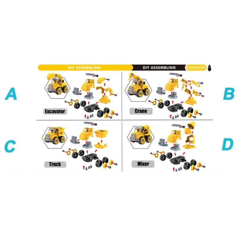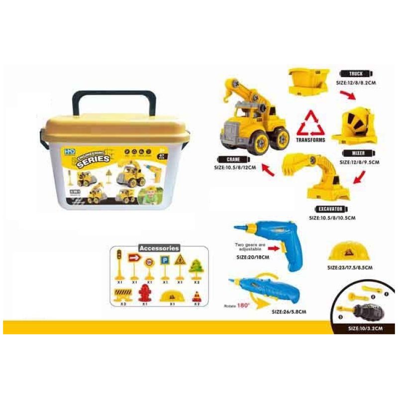 U paketu dolaze odvijači i bušilice. Ovo je 4 u 1 inženjerska igračka kamiona što znači da djeca mogu sagraditi 4 različite vrste kamiona koristeći istu glavnu karoseriju. Ovi kamioni koji se sastavljaju i rastavljaju, te su savršeni za male inženjere koji vole koristiti alate. Ova igračka ima zaobljenu površinu i nema oštre rubove što ju čini sigurnom za igru.