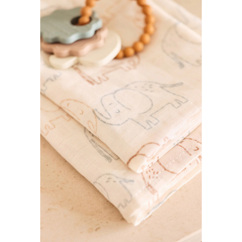 Ono što zaista čini ove pelene posebnima je njihov šarmantan dizajn s motivima slonova, koji donosi dozu razigranosti i topline u svakodnevnu njegu. Uz to, dolaze u praktičnom setu od dva komada dimenzija 115×115 cm, što omogućava svestranu primjenu – od povijanja do zaštite prilikom podoja ili kao lagana deka.