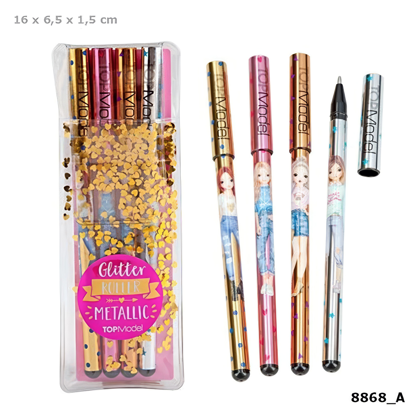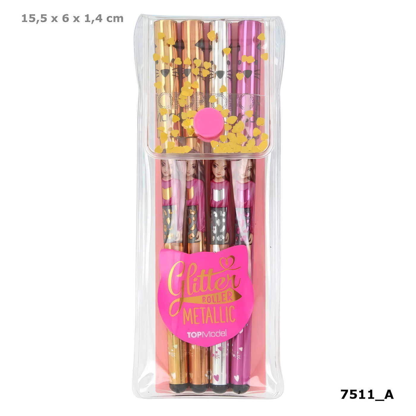 - Ekskluzivan Top model dizajn – Svaka olovka ukrašena je zlatnim konfetićima u obliku srca, za dodatnu dozu šarma i stila.