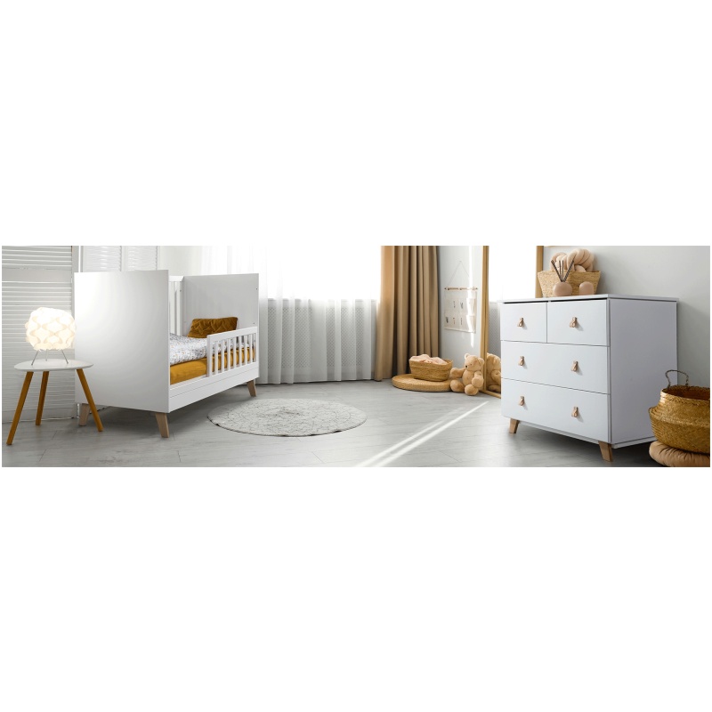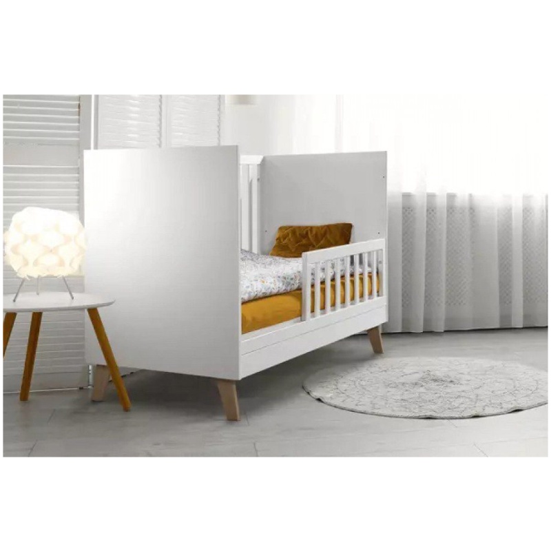 Ovaj krevetić je modernog dizajna bijele boje. Krevetić ima tri nivoa te se dno krevetića po uzrastu bebe može štimati na odgovarajuću visinu. Također ima dvije srednje prečke.