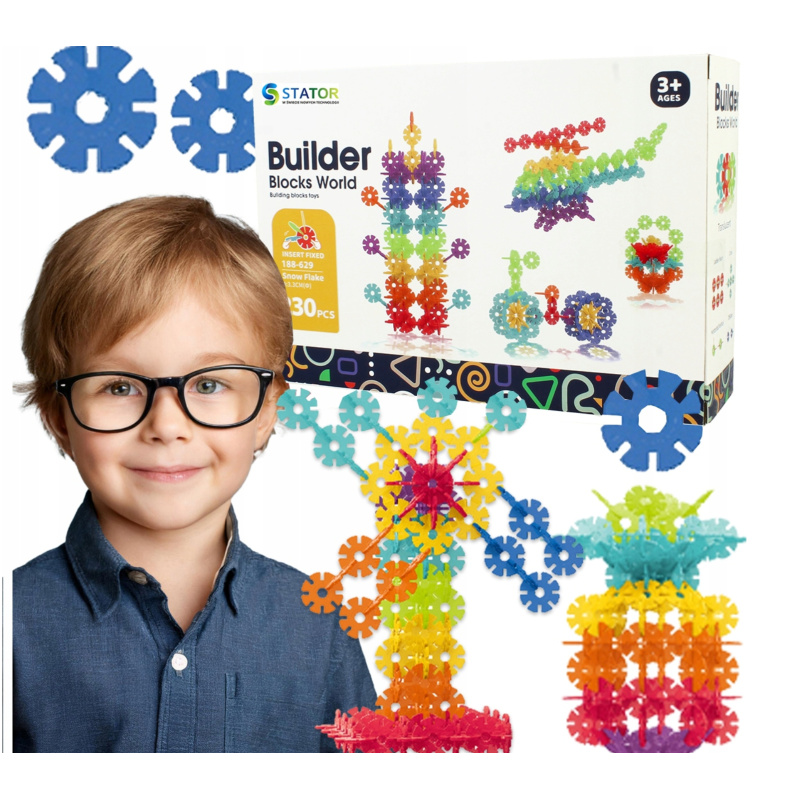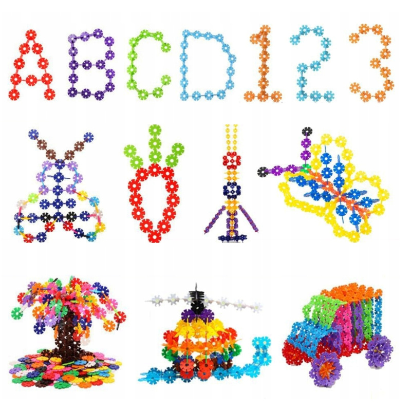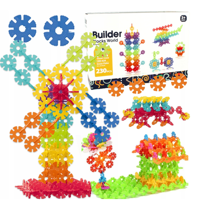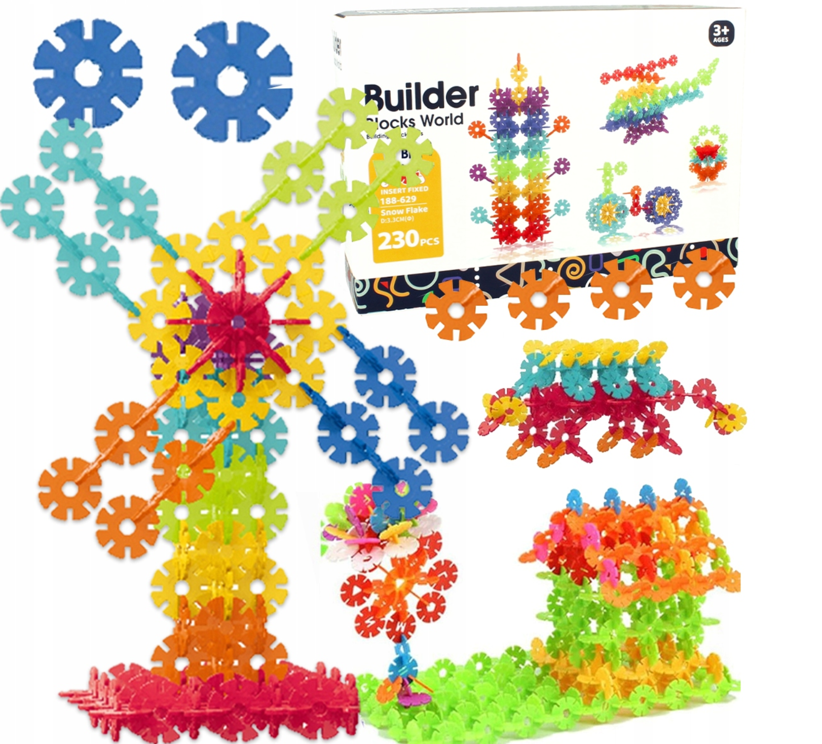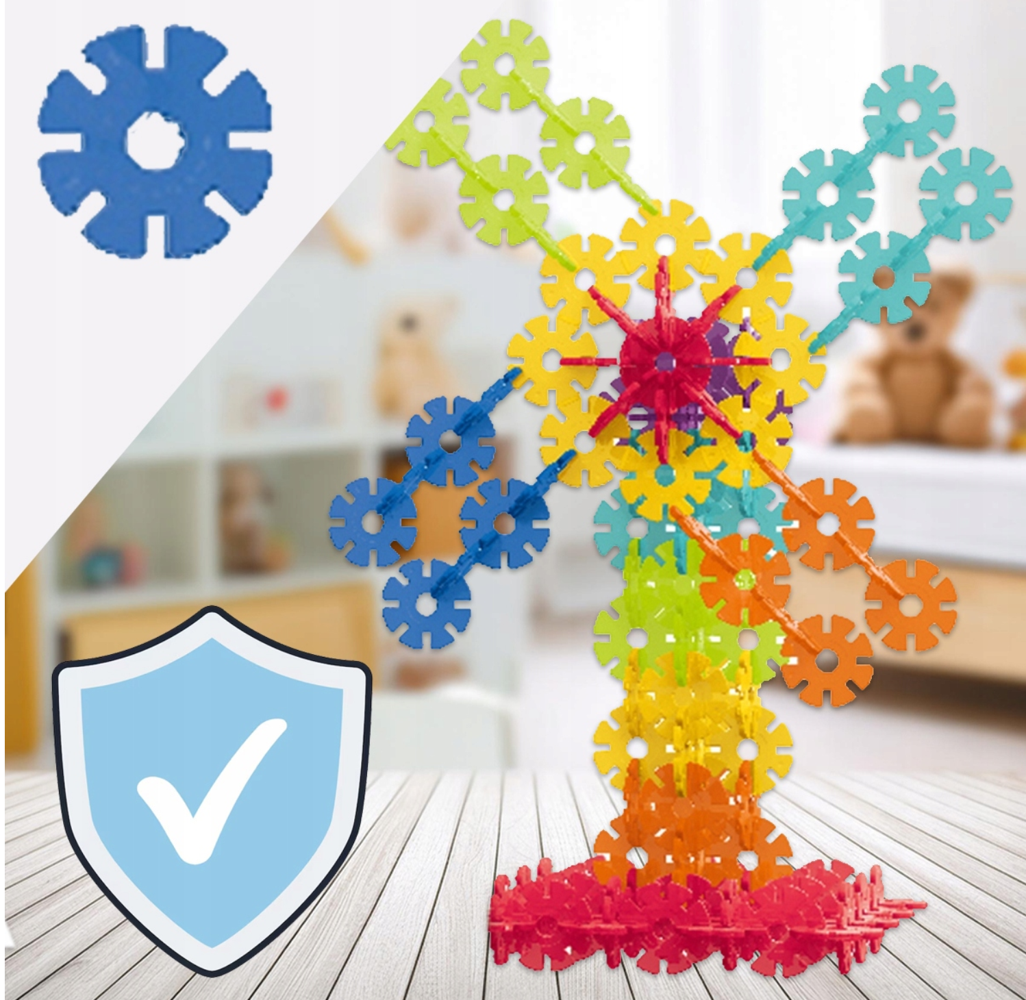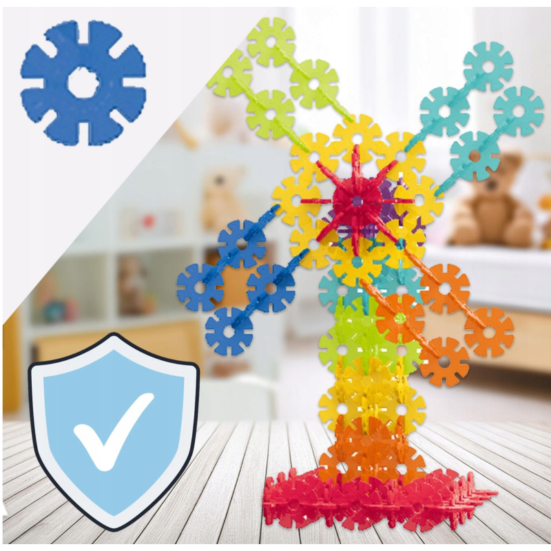Najveća prednost ovog seta je njegov jedinstveni oblik. Oblik “pahulje” omogućuje jednostavno spajanje krugova, pružajući stabilnost i izdržljivost svim kreacijama. Kocke su izrađene od visokokvalitetnog, netoksičnog plastika s glatkim rubovima, što ih čini potpuno sigurnima za djecu stariju od tri godine.