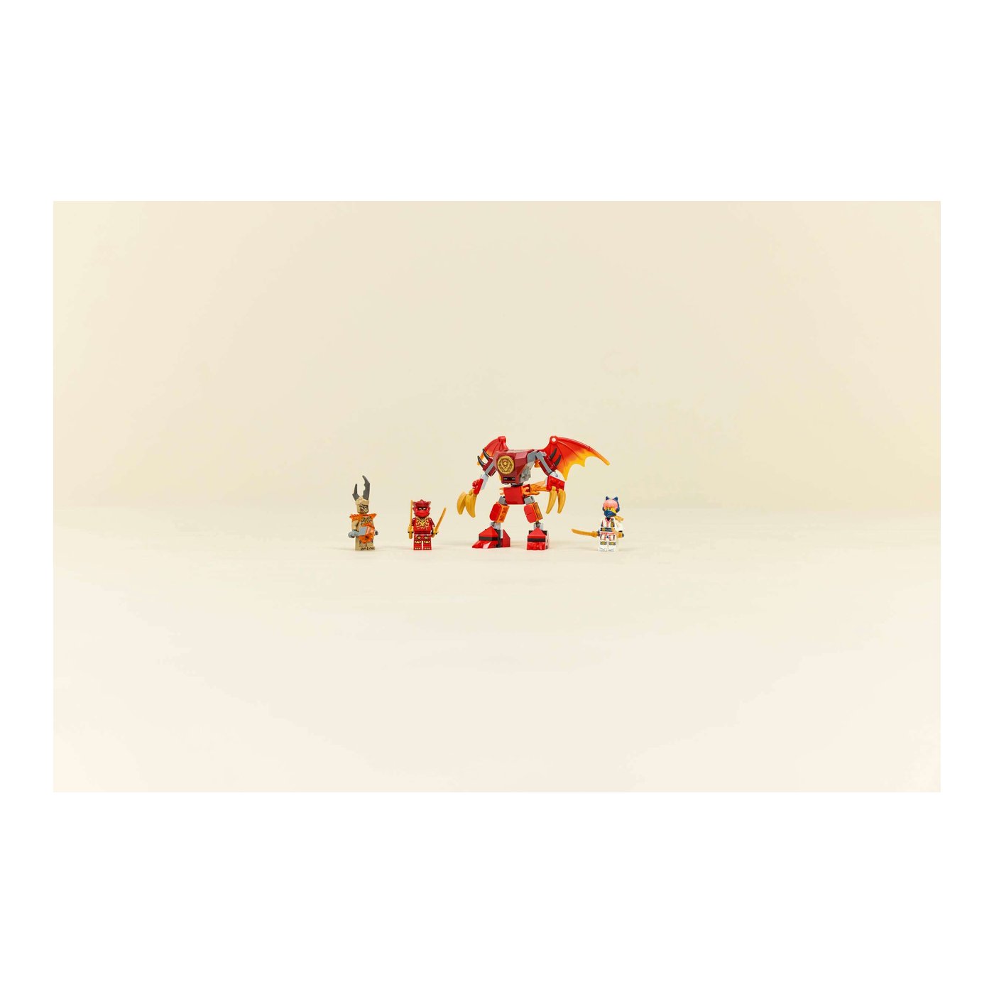 Ova fascinantna građevinska igračka sadrži zmajevskog mehanizma s pokretnim nogama, velikim krilima, kandžama i gornjim dijelom koji se rotira za 360 stupnjeva, stvarajući dinamične mogućnosti za igru. U kokpitu možete smjestiti minifiguru, dodajući još više uzbuđenja igri. Set uključuje tri minifigure: hrabrog Kaija s dva mača, borbenu Soru također s dva mača i zloglasno Zemaljsko Čudovište s kandžama, omogućujući djeci da ožive scene iz četvrte sezone NINJAGO Dragons Rising TV serije.