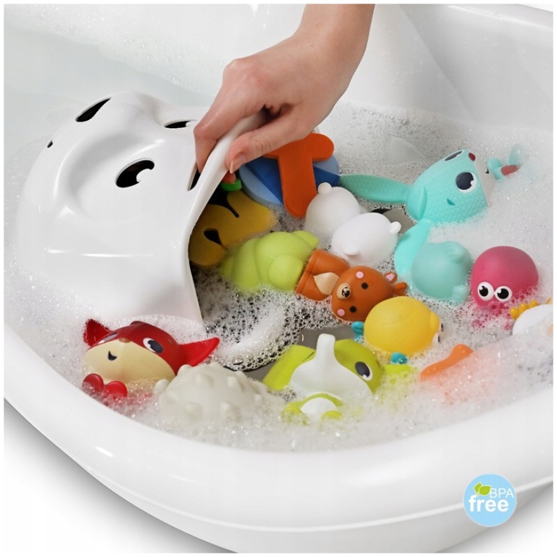 Korpa za igračke Panda je praktičan i lagan dodatak za igračke koji se može koristiti ne samo u kadi. Jednostavnim potezom možete izvući sve igračke iz vode i spremiti ih za daljnju uporabu. Zahvaljujući rupicama, proizvod se također može idealno koristiti kao ocjedilica. Korpu možete objesiti u kupaonici tako da je pričvrstite usisnim čašicama direktno na kadu ili tuš kabinu. Prije postavljanja usisnih čašica, površina treba biti prethodno očišćena. Budite oprezni! Djeca uvijek trebaju biti pod nadzorom odrasle osobe tijekom kupanja.