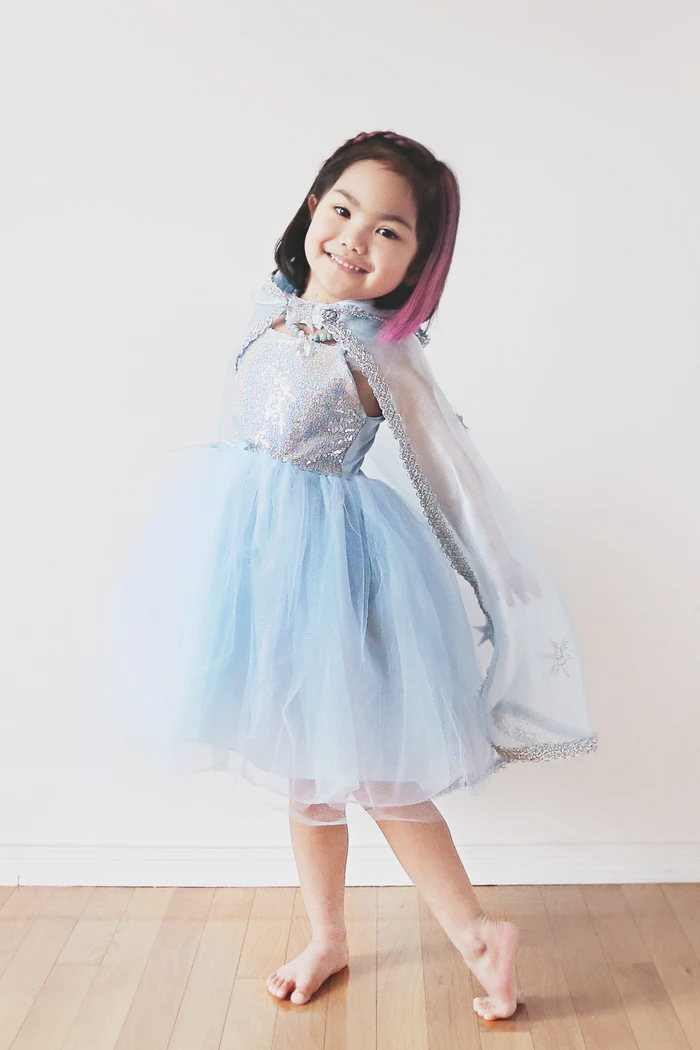 Uronite u svijet mašte i čarolije s našim prekrasnim Crystal Queen Plaštem. Ovaj očaravajući plašt, izrađen od plave kristalne organze, zasjat će poput zvjezdane noći s elegantnim srebrnim šljokicama koje oživljavaju svaku dječju igru. Velika kapa pruža dodatnu dozu misterije i avanture, omogućujući vašem djetetu da se pretvori u snježnu kraljicu iz omiljenih bajki.