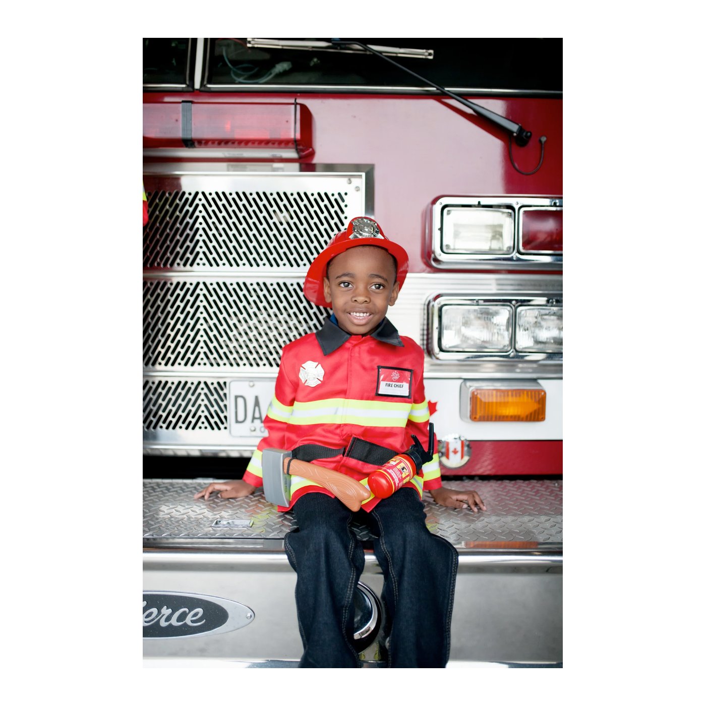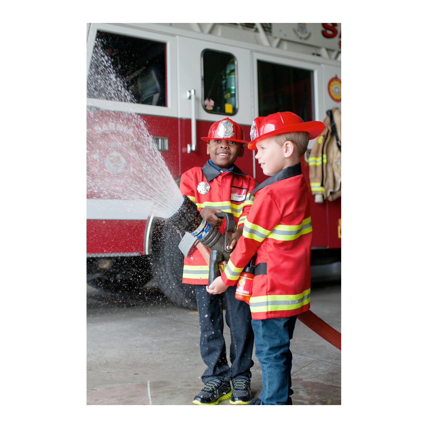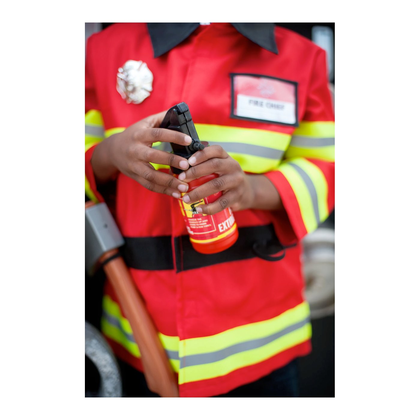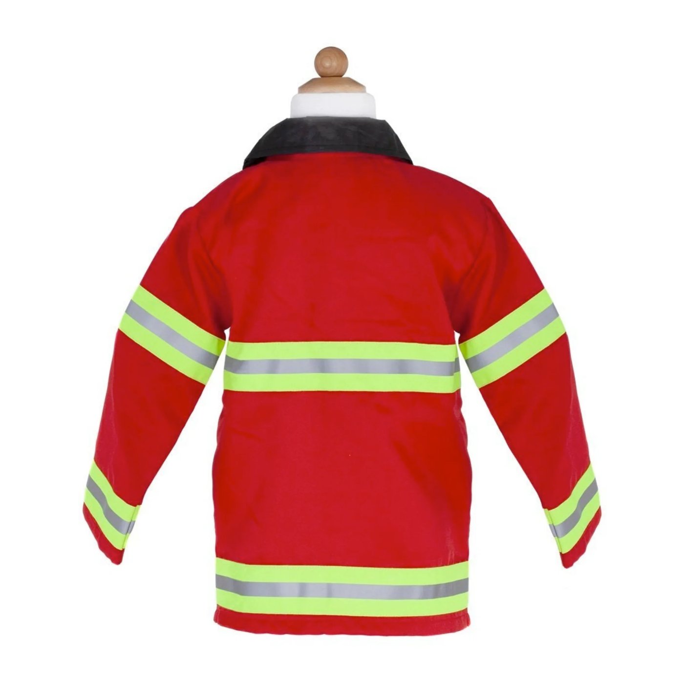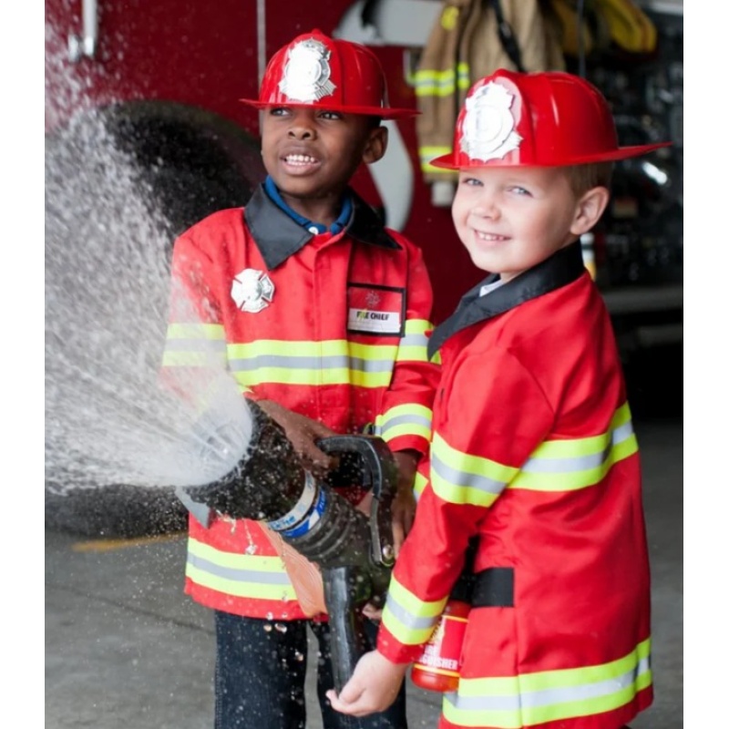 Crveni kaput s reflektirajućim trakama potiče osjećaj odgovornosti i brige za sigurnost, dok prilagodljiva plaketa s imenom i vatrogasna značka pojačavaju osjećaj osobnog postignuća.