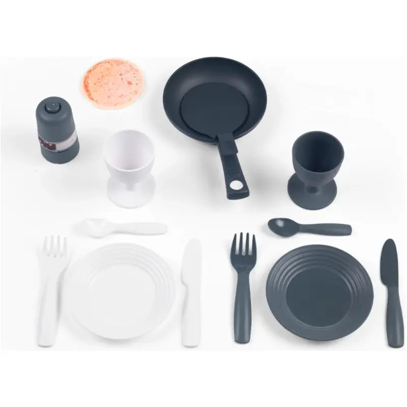 U paketu se nalazi čak 13 dodataka: 2 tanjura, 2 vilice, 2 noža, 2 žlice, 2 čaše, 1 tava, 1 palačinka, 1 sol i biber mlin. Mnogi od ovih dodataka imaju mehaničke funkcije, tako da će vaše dijete moći pripremati palačinke i začiniti svoje obroke kao pravi kuhar!