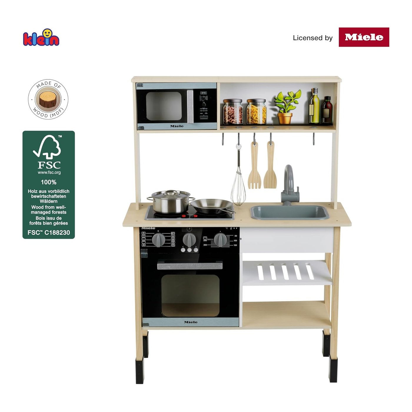 Theo Klein Miele 7187 je drvena dječja kuhinja za djecu od 3 godine naviše koja donosi više realizma kroz plamenik sa zvukom i svjetlom te uključeno posuđe. Dobar je izbor za roditelje koji žele kvalitetan kuhinjski set koji razvija maštu i traje dulje od osnovnih, jednostavnijih modela.