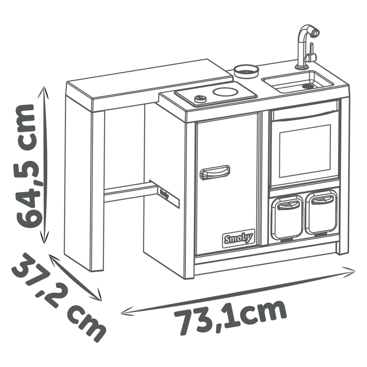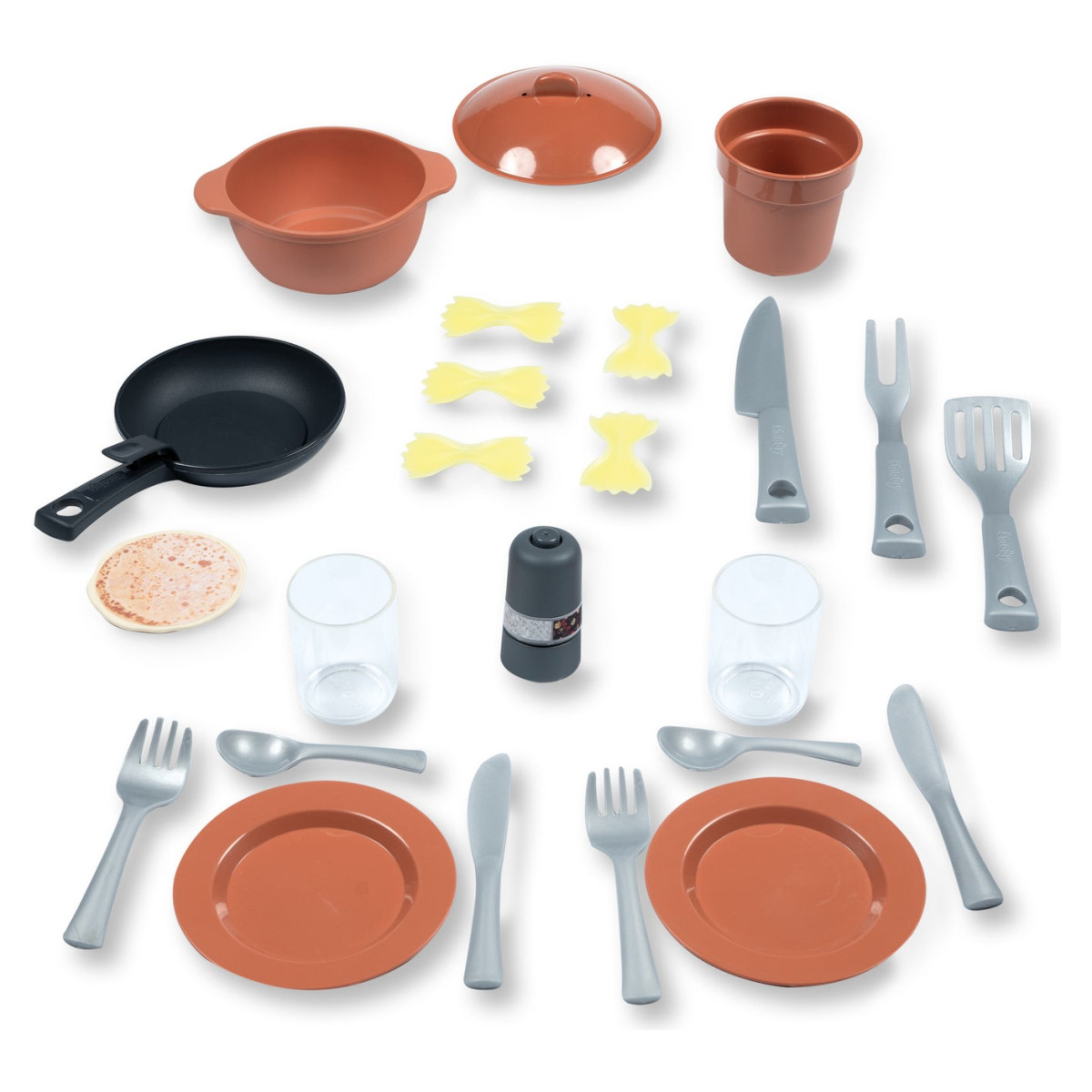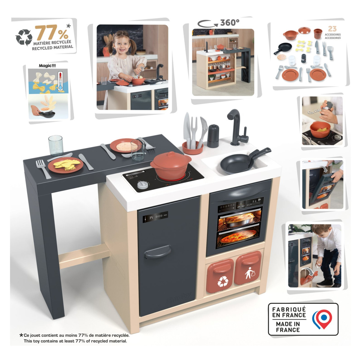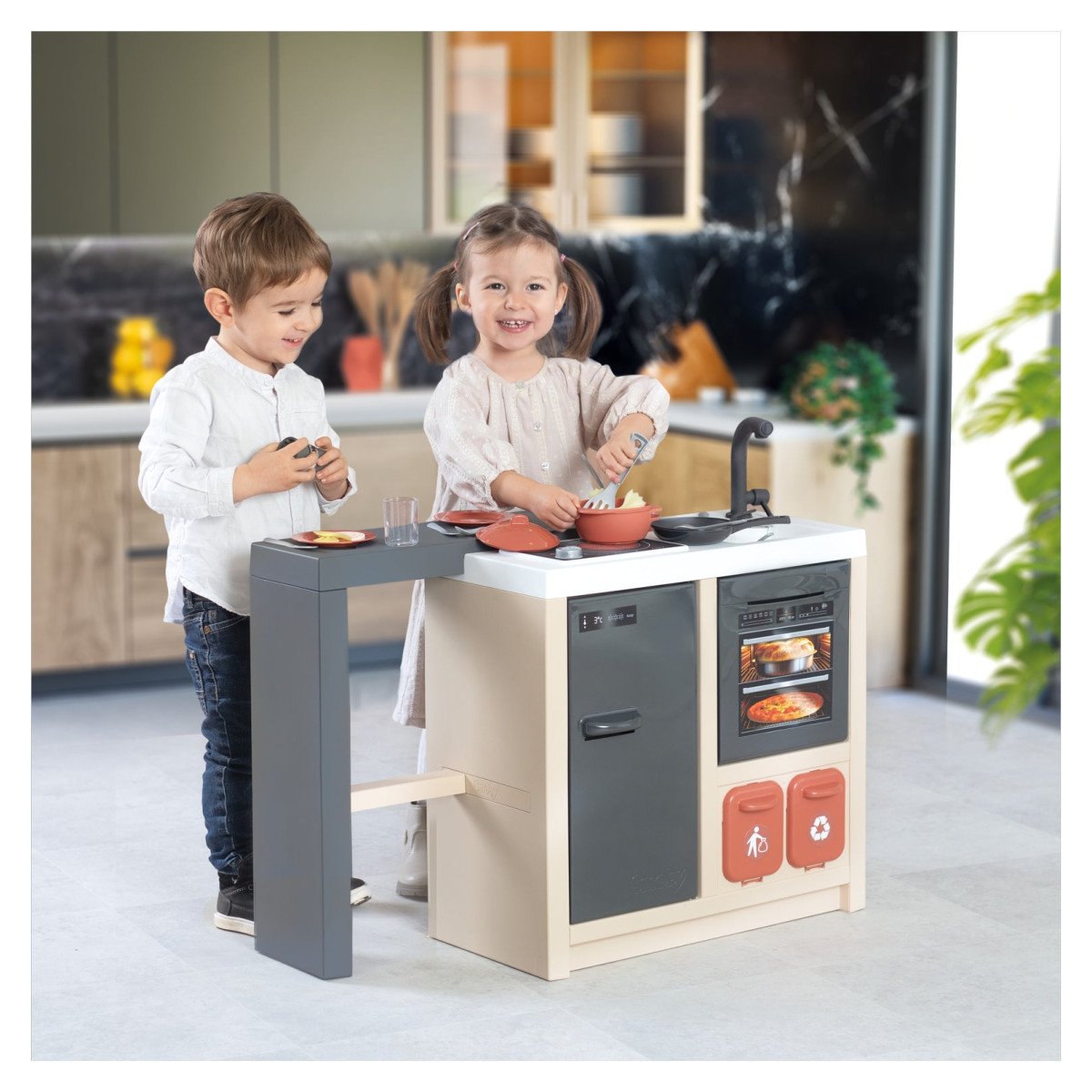 Ovaj set nudi realistične funkcije i bogat izbor dodataka – od pećnice i frižidera do ploče za kuhanje s okretnim dugmetima i modernim sudoperom. S ukupno 23 dodatka, djeca mogu slagati obroke, posluživati goste i usvajati svakodnevne vještine kroz igru. Praktična organizacija s dvije kutije za razvrstavanje omogućuje urednost i lako spremanje nakon igre.