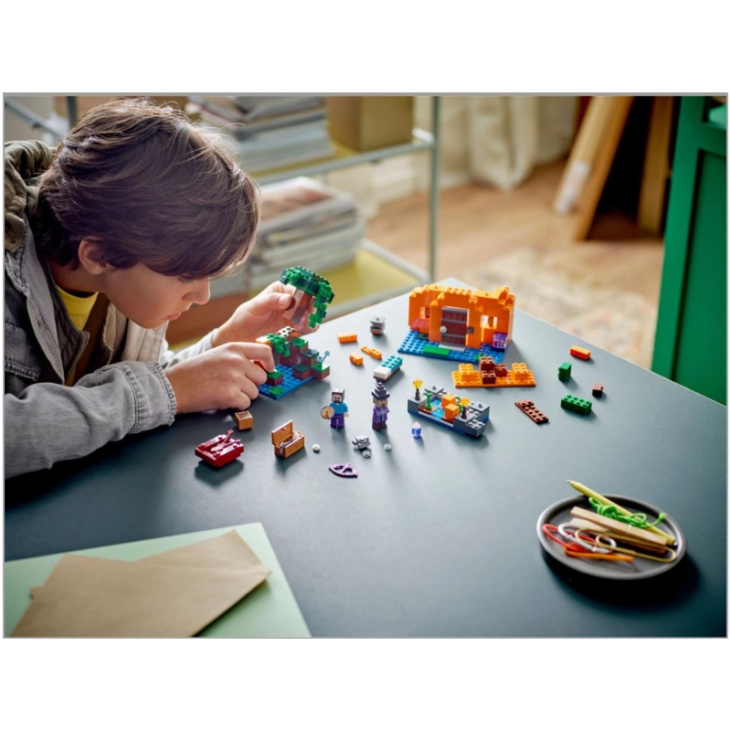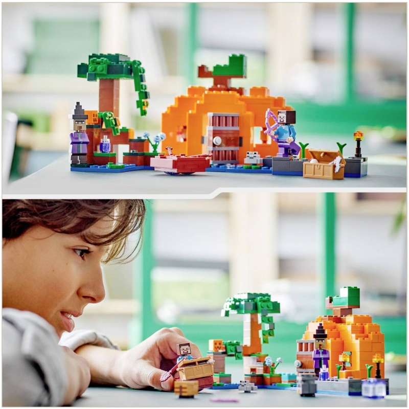 Postavljen u slavnom močvarnom biotopu Minecraft igre, ovaj visoko prilagodljiv igrački set donosi lika Stevea na farmu bundeva koja je izgrađena oko kuće u obliku bundeve. Unutar kuće se nalazi namješteni interijer s krevetom, radnim stolom, pećnicom i svjetlima u obliku žaba. Izvan kuće se nalazi polje bundeva koje Steve obrađuje svojom motikom. Mogućnosti igre prelaze na borbu kada vještica baca napitke na Stevea, ali on se odupire koristeći svoj luk. Set također uključuje žabe, brod i sanduk s jajetom i šećerom, pružajući djeci priliku da naprave pitu od bundeve!