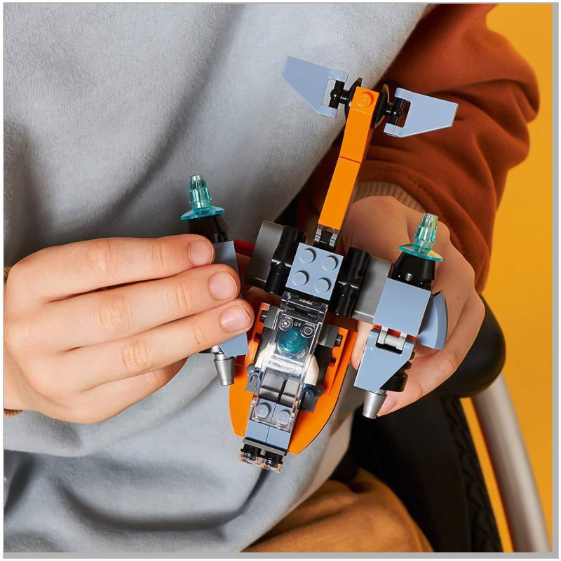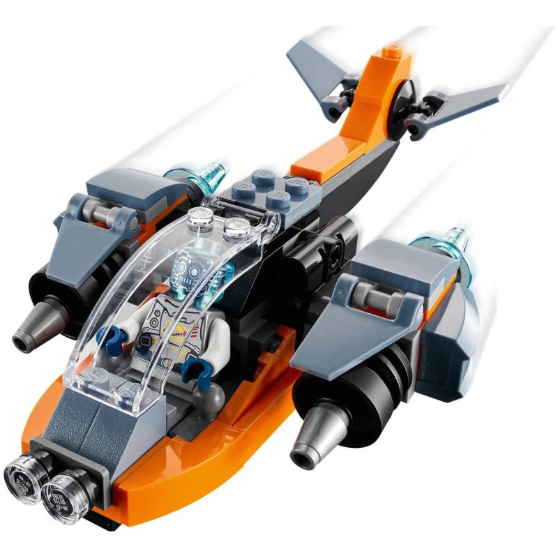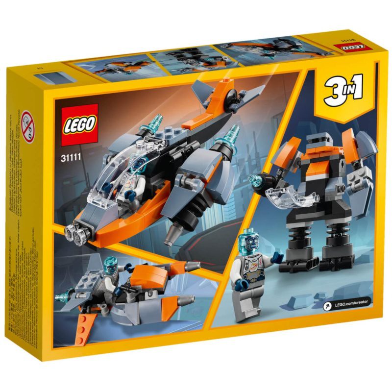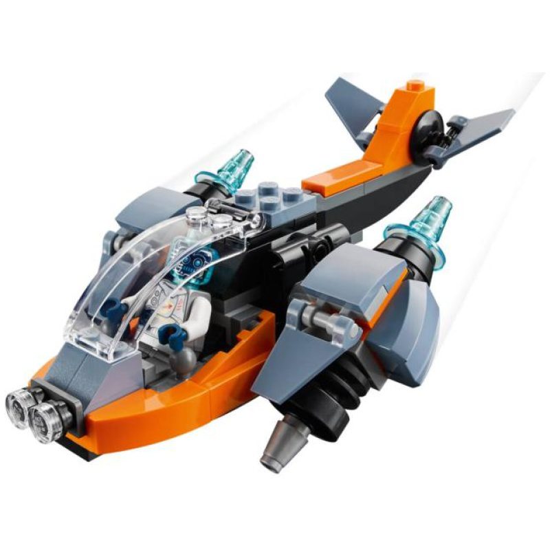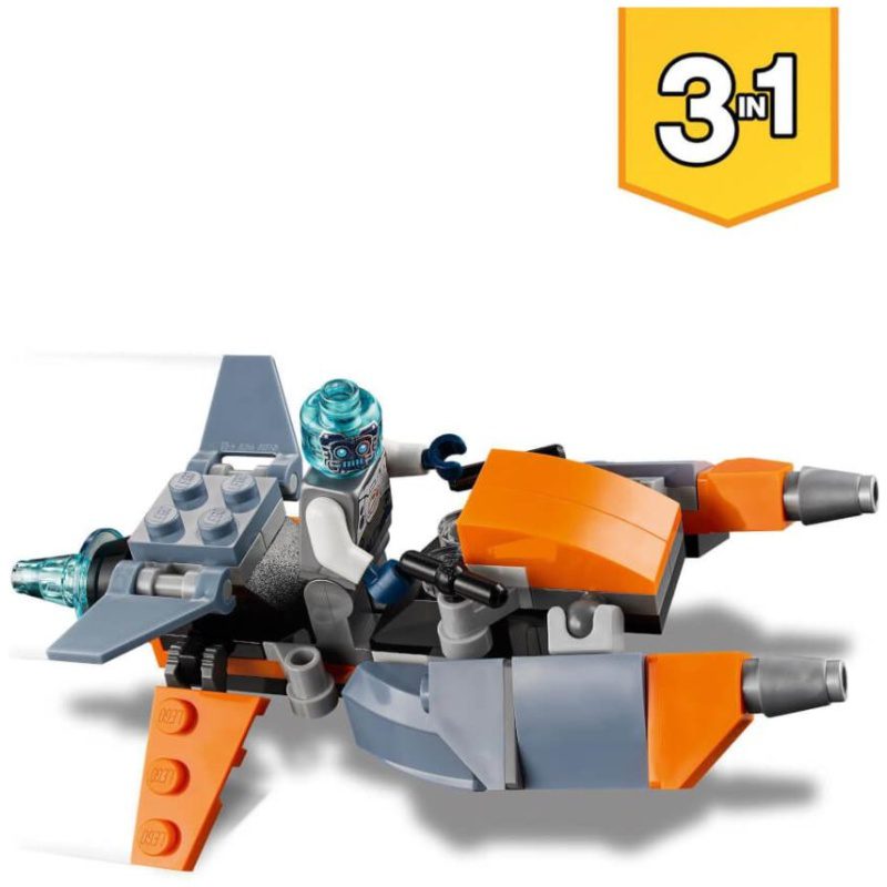 Otkrij uzbudljive nove planete u kibernetičkom dronu. Uskoči u kabinu, uključi potisnike i odleti u svemir s figuricom robota na odvažne pustolovine! Kada sletiš, pretvori ga u sjajni kibernetički robot i nastavi putovanje, pretvori ga u kibernetički skuter i odjuri u akciju ili sastavi nešto iz svoje mašte. Uživaj u satima svemirske zabave u nevjerojatnom kompletu 3-u-1!