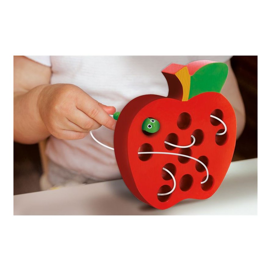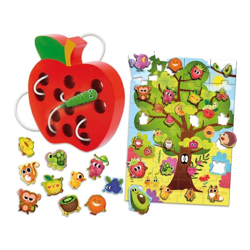 Ova jedinstvena igračka temelji se na Montessori metodi, poznatoj po svom pristupu učenju kroz iskustvo. Djeca će kroz igre otkriti svijet putem svojih osjetila, što će ih potaknuti na istraživanje i razvijanje kognitivnih sposobnosti. Sastoji se od šarene drvene jabuke i simpatične gusjenice, te maxi puzzle dimenzija 50 x 70 cm. Djeca će uživati u slaganju oblika i otkrivanju novih tekstura, čime će razvijati finu motoriku i koordinaciju ruka-oko.