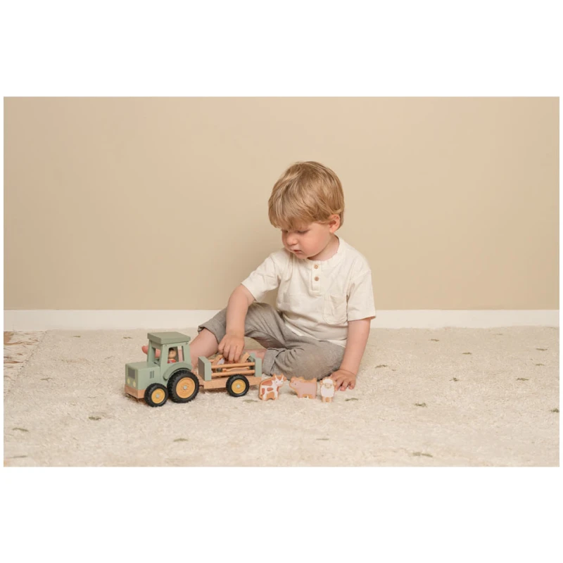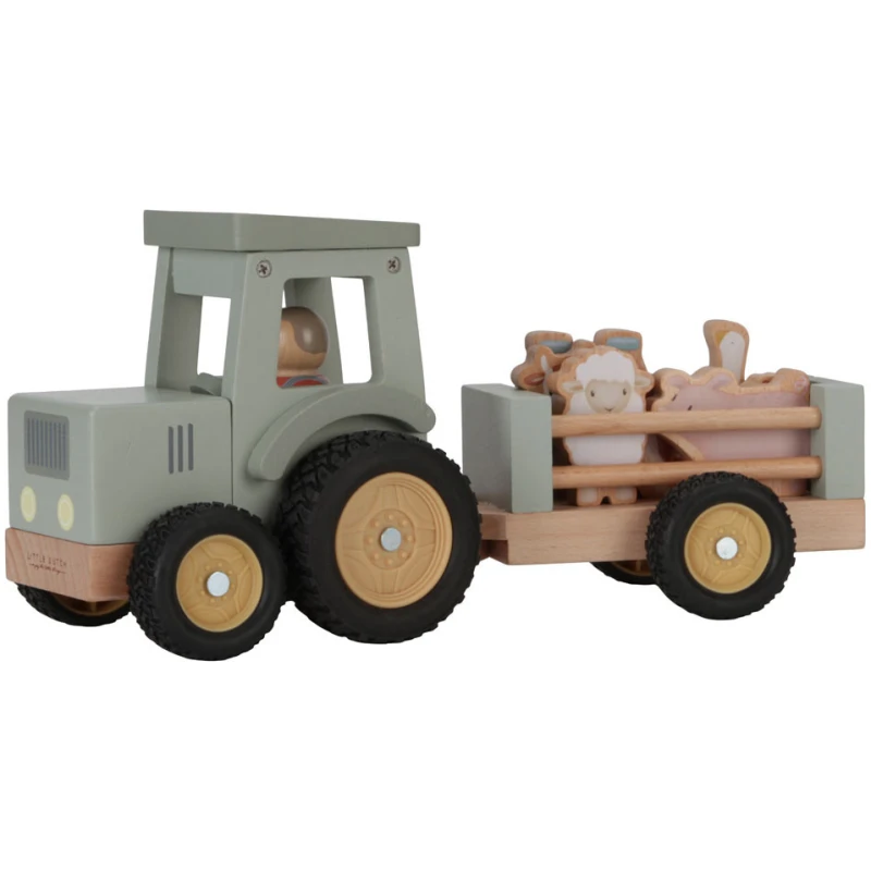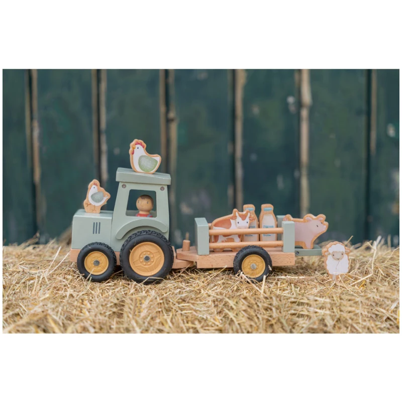 Vrum vrum! Dolazi traktor s svim životinjama i mlijekom! Predstavljamo vam super zabavnu igračku koja će potaknuti maštu tvog malog prijatelja – Little Dutch Drveni Traktor S Prikolicom.