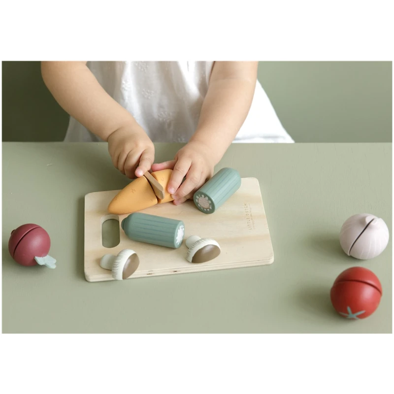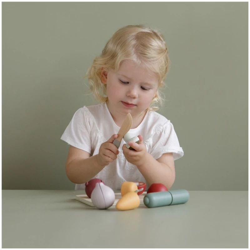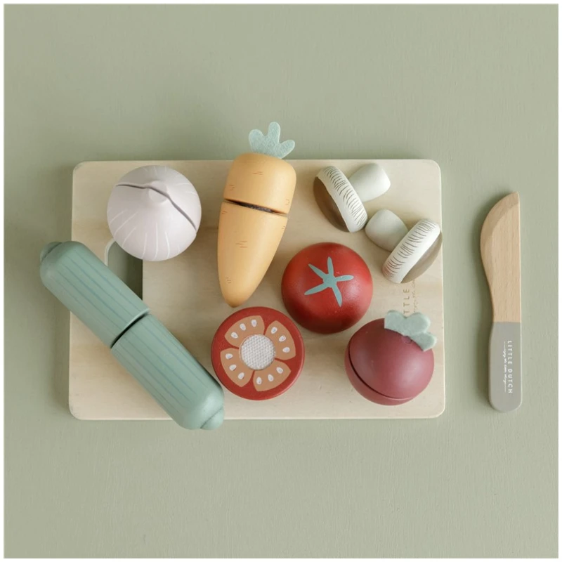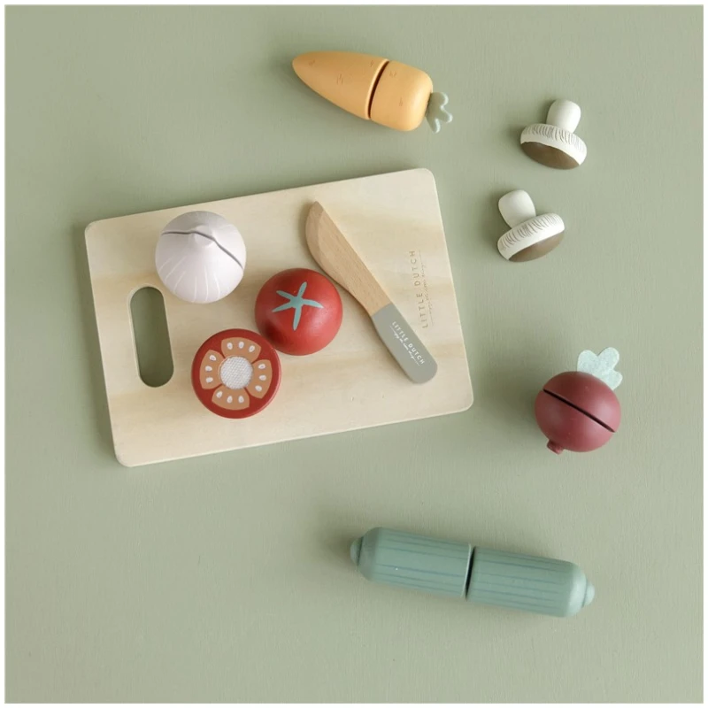 Set uključuje različite vrste povrća poput mrkve, gljiva, krastavca, paradajza, luka i korijena repe. Povrće je izrađeno od kvalitetnog drva i dolazi s drvenim nožem i daskom za rezanje. Dijete može vježbati svoje motoričke vještine i naučiti kako rezati povrće kao pravi kuhar.