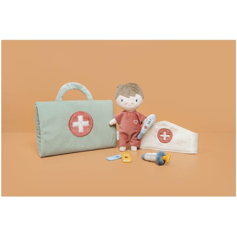 Doktore, Jim treba tvoju njegu! Pogledaj ga u njegovoj pidžami, jedva čeka da zajedno igramo medicinske sestre! U njegovom koferu se nalazi sve što ti treba da se brineš o njemu. Prvo, izmjeri temperaturu pacijenta. Je li flaster dovoljan da ublaži bol? A koja lutka će biti tvoj sljedeći pacijent? Ovaj medicinski set sa lutkom Jim pruža sate zabave. Meki kofer se otvara kao krevet u bolnici i sadrži osnovne stvari potrebne za tretman pacijenta.