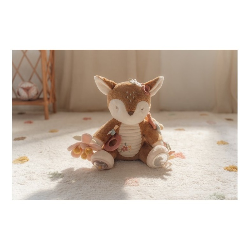 Srna Fairy Garden nije obična plišana igračka. Sa šuškavim leptirićem na ramenu, zvučnim efektima zveckanja, naljepnicama i cvjetićima koji pozivaju na dodir, ova igračka nudi više od igre. Njene raznobojne prstenove i ogledalo na jednoj nozi, kao i rep u obliku jagode, osmišljeni su kako bi potaknuli istraživački duh i motoričke vještine svakog djeteta. Uz dimenzije 25 x 22 x 27 cm, savršeno se uklapa u ruke malih istraživača.