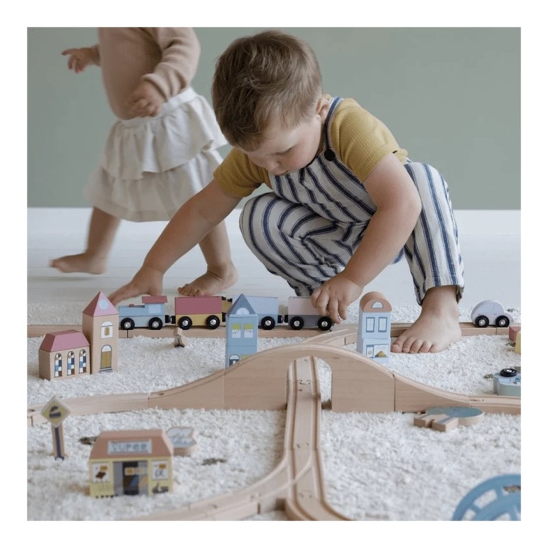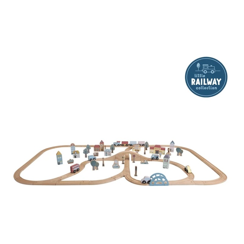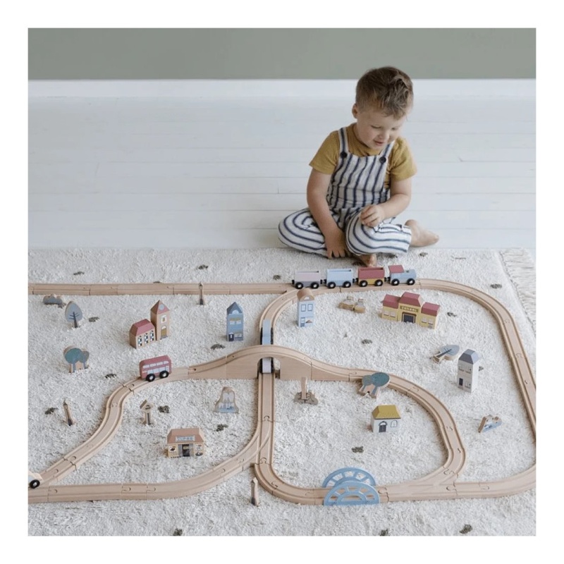 Kombinacija raznih elemenata – ravnih i zakrivljenih tračnica, mosta, automobila, ljudi, drveća i mnogih drugih dodataka – čini ovaj set idealnim za razvijanje mašte i finih motoričkih vještina. Djeca će s lakoćom stvarati vlastite priče i scenarije, neprestano istražujući i učeći o urbanom životu i pravilima prometa. Svaka drvena figura oslikana je s detaljima s obje strane, što dodatno obogaćuje igru i omogućuje djeci da se potpuno urone u svoje igračke svjetove.