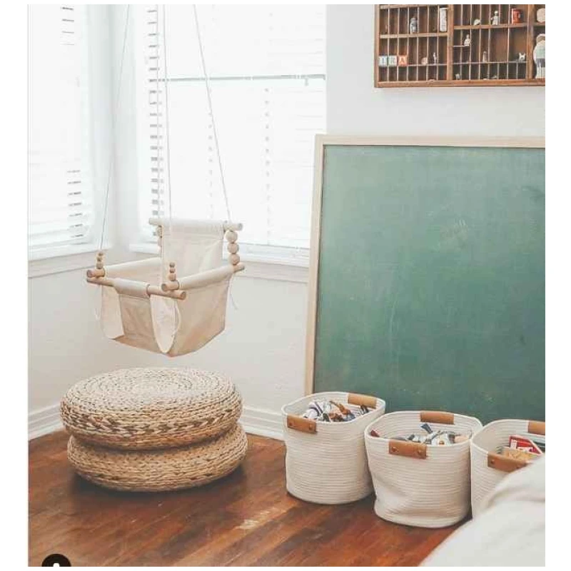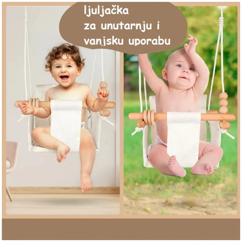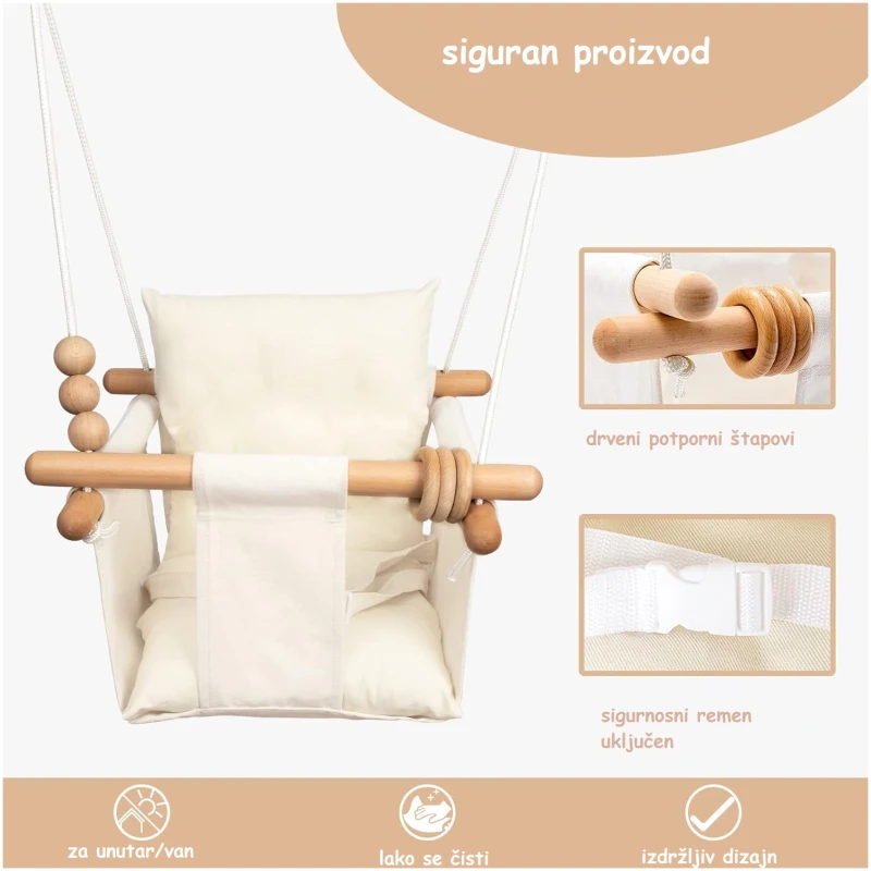 Mekani i kvalitetni materijali – Naša ljuljačka za malu djecu ima meku tkaninu (može se prati u perilici rublja) i jastuke s poliesterskim punjenjem koje je ugodno za kožu i nudi dodatnu udobnost i podršku vašem mališanu. Za okvir viseće ljuljačke za bebe koristi se visokokvalitetno prirodno drvo bukve, glatko i prirodnog mirisa.