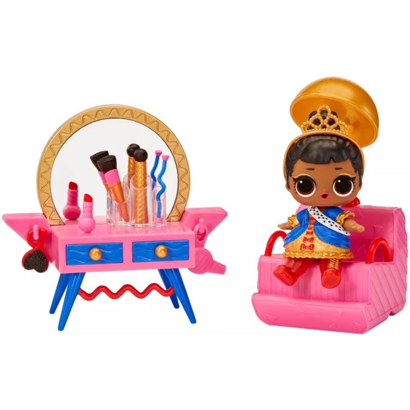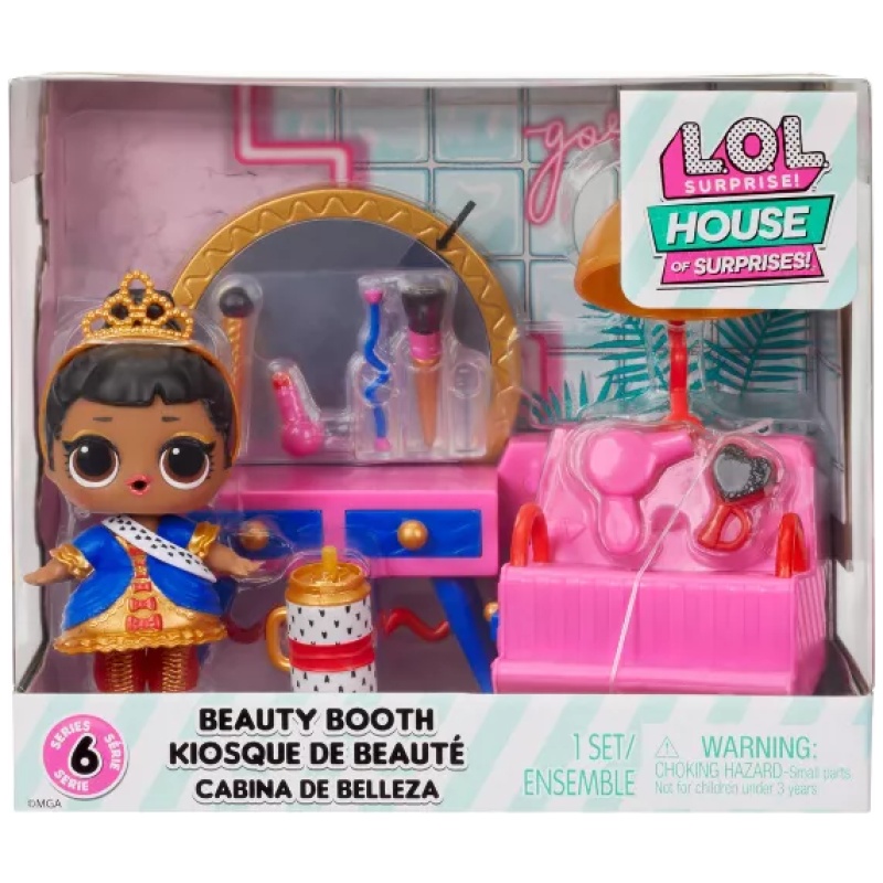 O.M.G.! Pogledajte ovaj sjajni novi playset! L.O.L. Surprise Beauty Booth Playset dolazi s 8 iznenađenja i ekskluzivnom lutkom. Upoznajte Her Majesty, sestru Nia Regal, omiljenu B.B. lutku koja donosi glamur u glamurozni stil. Jeste li spremni dodati štand za ljepotu svojoj L.O.L. Surprise! O.M.G. House of Surprises kućici? Beauty Booth Playset savršeno se uklapa u spa, tako da se sve B.B. lutke mogu razmaziti u stilu. Svaki set za igru uključuje ekskluzivnu lutku, stolić za šminkanje, salonsku stolicu, sušilo za kosu, četkice za šminkanje, kozmetiku, organizator ljepote, odjevni komad, tiaru, četkicu za kosu, odjevni komad i bocu.