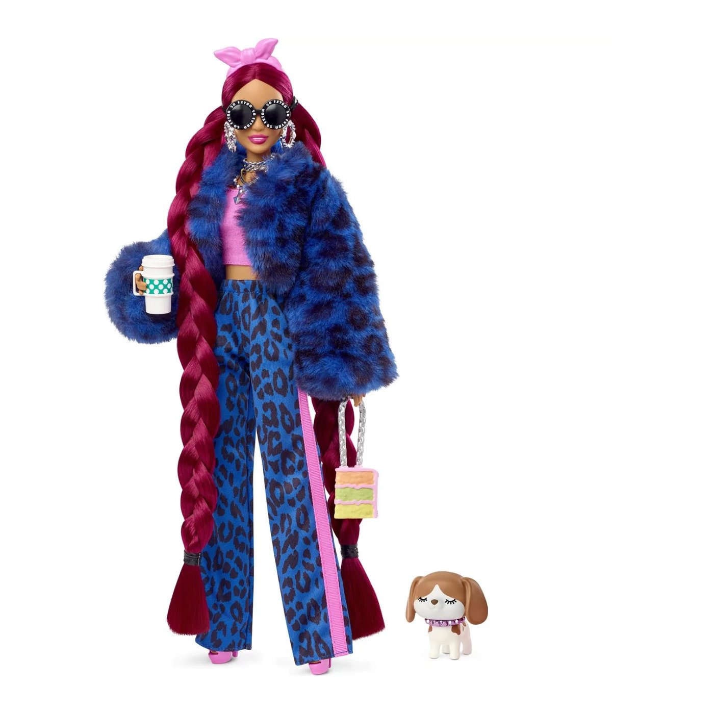 Posebnost Barbie Extra-Blue Leopard leži u njezinoj prepoznatljivoj krznenoj jakni s leopard printom koja savršeno pristaje uz matching trenerku i roze patike. Ovaj jedinstveni stil nije samo moderan; on je izjavan. Uz 15 modnih komada, uključujući torbicu u obliku parčeta torte i velike crne sunčane naočale, svaka modna avantura je moguća. Njen preslatki ljubimac dodaje dodatni sloj zabave i karaktera, čineći Barbie Extra savršenim suputnikom u svijetu mode.