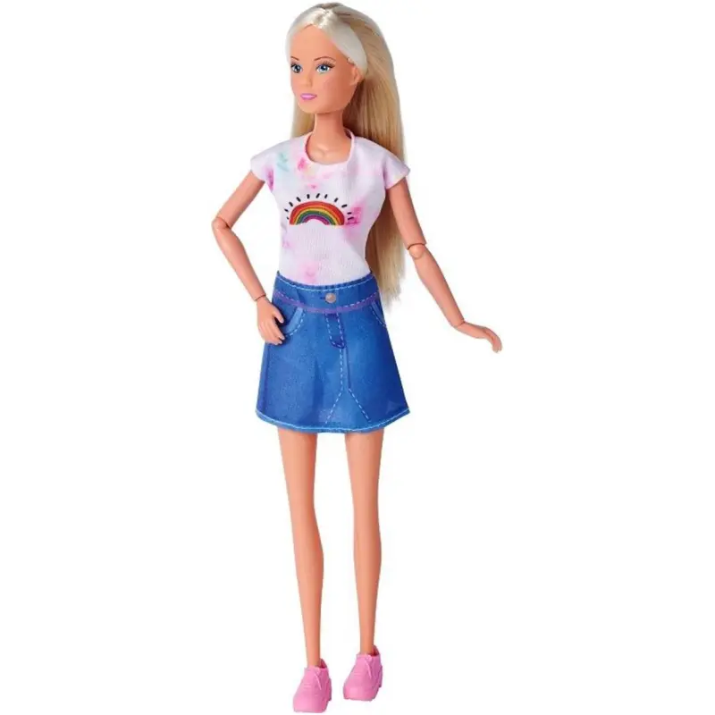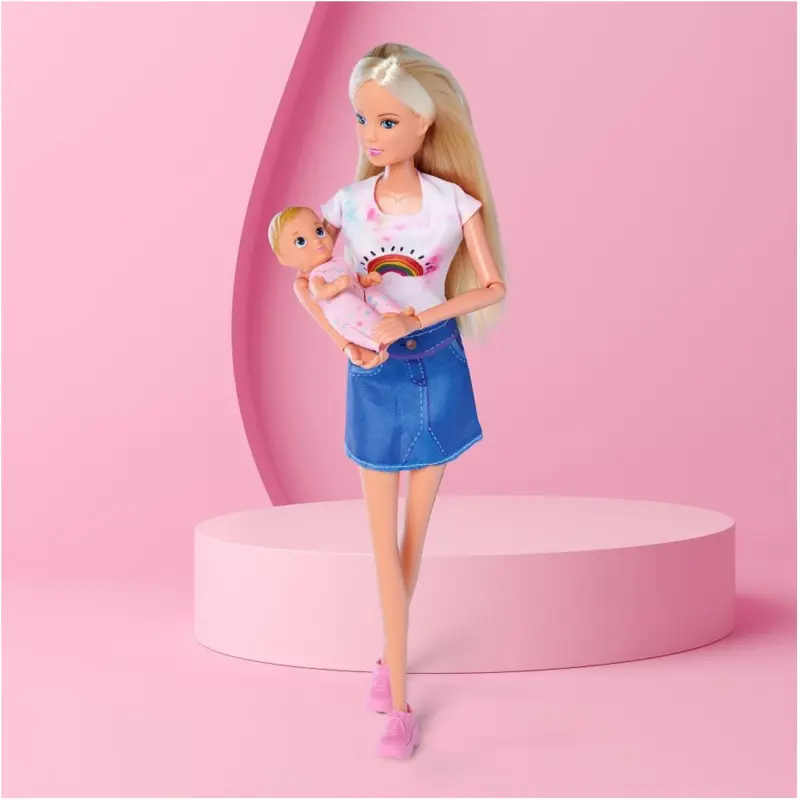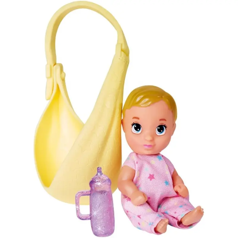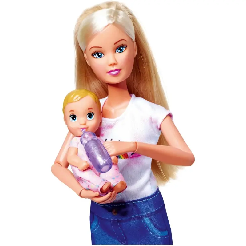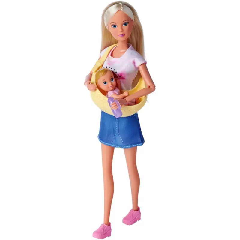 Steffi može ići bilo gdje sa svojom slatkom bebom. Naglavni šal savršeno funkcionira kao nosiljka za bebu, zahvaljujući kojoj će beba u slatkoj ružičastoj odjeći uvijek biti blizu svoje majke. Uključena bočica će olakšati brigu o bebinom lutku svakodnevno, a dojenje će biti ugodnije jer je bočica ukrašena šljokicama.
