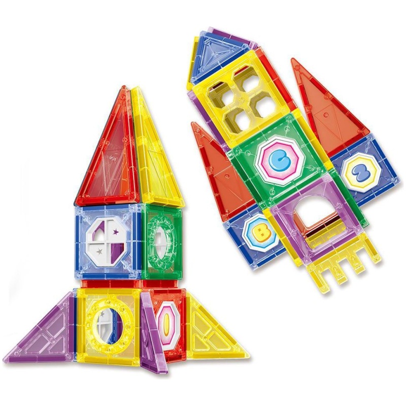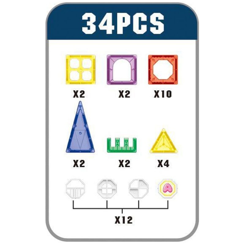 Set dolazi u raznovrsnim bojama sa 34 magnetne pločice u različitim oblicima i bojama, što pomaže djeci da se brzo usredotoče na igru. Bez brige o bilo kakvim potencijalno štetnim kemikalijama ili toksinima, Magnetne Kocke su siguran način za razvoj djetetova uma i maštovitosti.