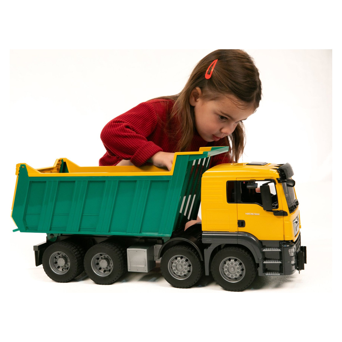 Velika kiperska platforma omogućuje jednostavno istovarivanje, dok robusne gume i stabilan četveroosovinski dizajn osiguravaju sigurno kretanje po svim terenima. Ova igračka savršeno se nadopunjuje s drugim građevinskim strojevima, pa mali majstori mogu slagati vlastite scenarije i razvijati vještine kroz igru. Sve je spremno za sate zabave, učenja i maštovitih avantura!