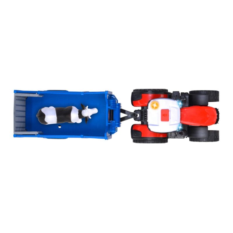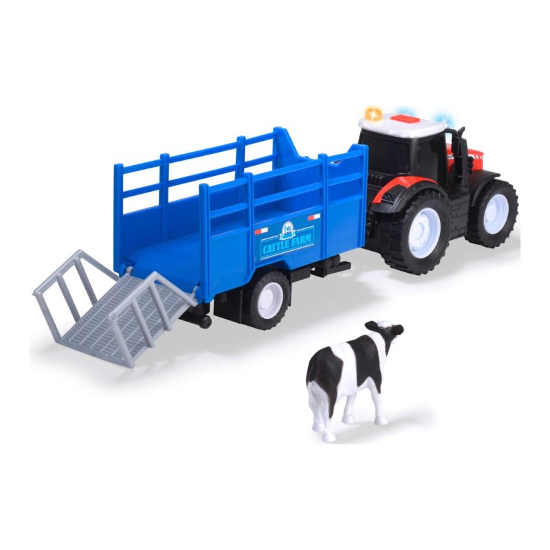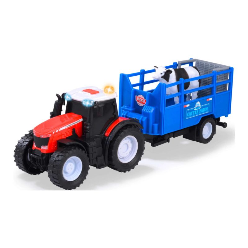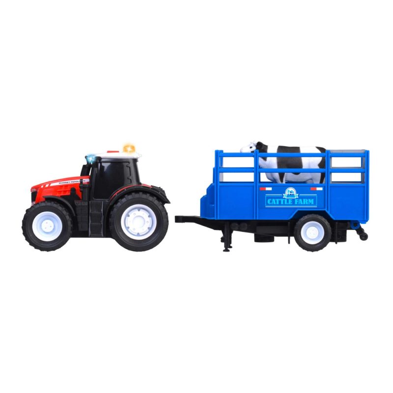 Ovaj set s Massey Ferguson traktorom i prikolicom dužine 26 cm je ultimativna igračka za mlade poljoprivrednike u nastajanju. Prikolica je posebno dizajnirana za transport životinja i ima malu preklopnu rampu na zadnjem dijelu za utovar i istovar. Traktor je službeno licenciran od strane kompanije Massey Ferguson i dizajniran je na temelju originalnog vozila. Također ima okretna kotače za lako manevriranje, kao i realne svjetlosne i zvučne efekte – savršeno za igru na temu farme! Set također uključuje kravu crno-bijele boje, koju možete transportirati na životinjskoj prikolici. Namijenjen je djeci starijoj od 3 godine, dolazi sa 2x 1.5V AAA baterijama i odlično se uklapa u svaku farmu igračaka.