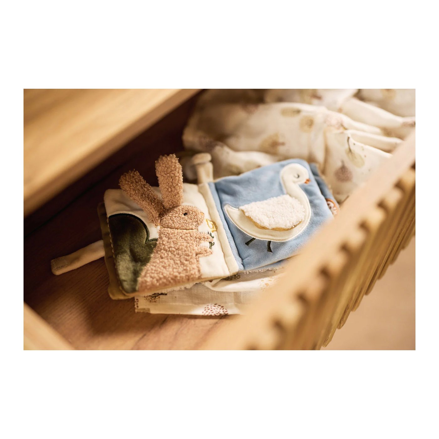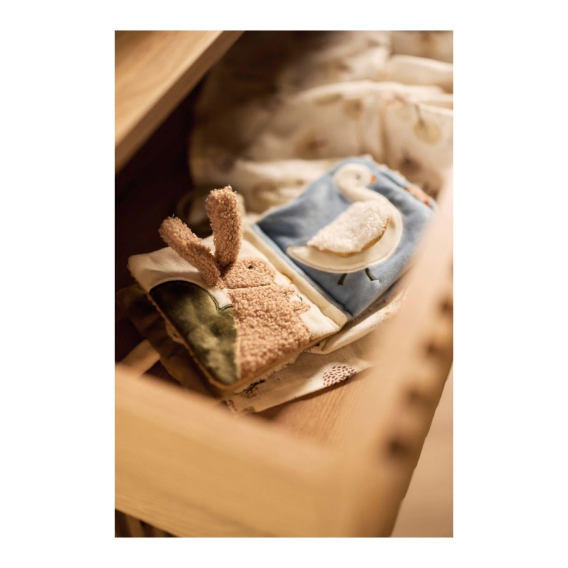 Zamislite svijet u kojem svaka stranica priča svoju priču. U ovoj knjizi, svaka od četiri stranice otkriva novog životinjskog prijatelja – zeca, pticu, patku ili labuda, dok šuštavi materijali omogućuju vašem mališanu da kroz igru istražuje nove teksture i zvukove. Dodajte tome zrcalo i malena stabla, koja dodatno potiču interakciju i interes djeteta, i dobili ste savršenu igračku za mališane koji su tek počeli otkrivati svijet.