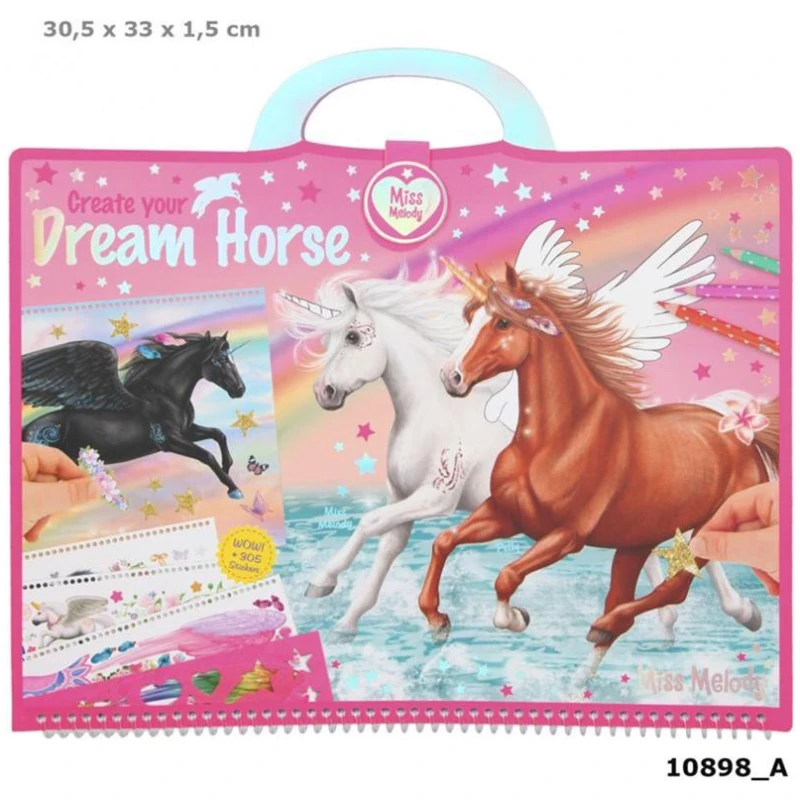 Stvaranje vlastitog konja iz snova nikad nije bilo jednostavnije! Upoznajte Miss Melody bojanku “Kreiraj svoje konje iz snova” koja će vas oduševiti modernim dizajnom i praktičnom torbicom. Ova bojanka ima obilje sadržaja koji će ispuniti sva vaša očekivanja!