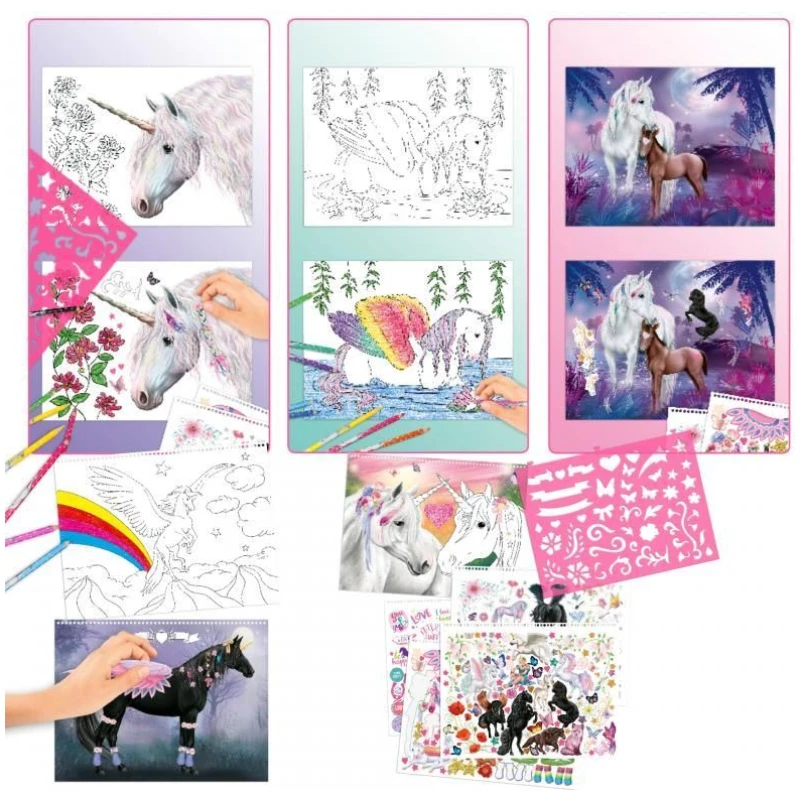 S čak 60 stranica sadržaja, ova bojanka nudi bezbroj mogućnosti za kreativnost i zabavu. Ali to nije sve! Uz nju dolaze i filmske naljepnice koje će vaš crtež pretvoriti u pravi mali film, papirnate naljepnice kojima možete ukrašavati svoje kreacije i šablone koje će vam pomoći da stvarate konje iz snova.